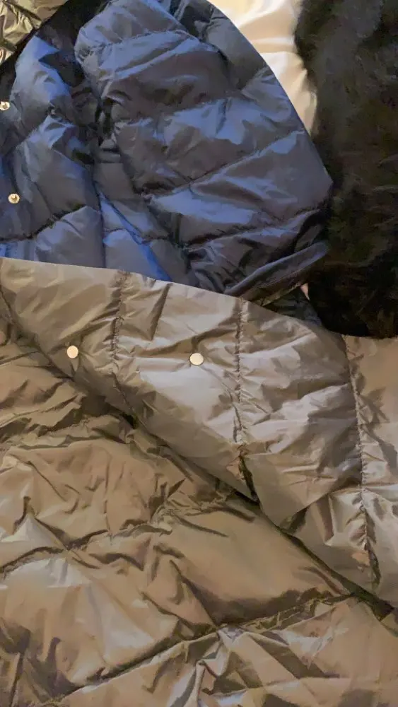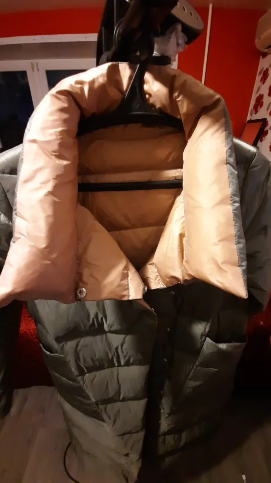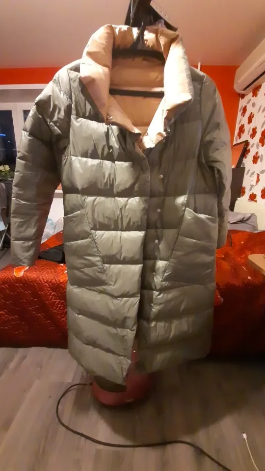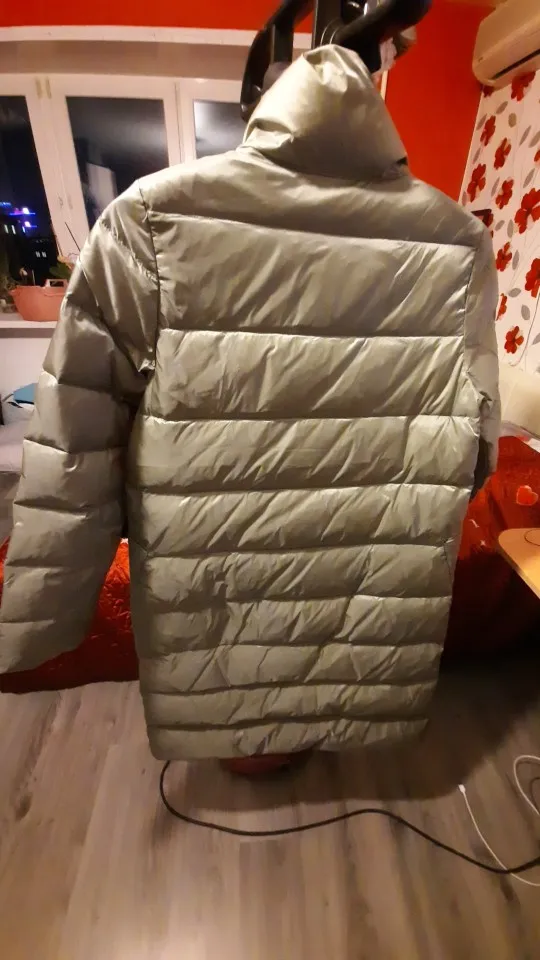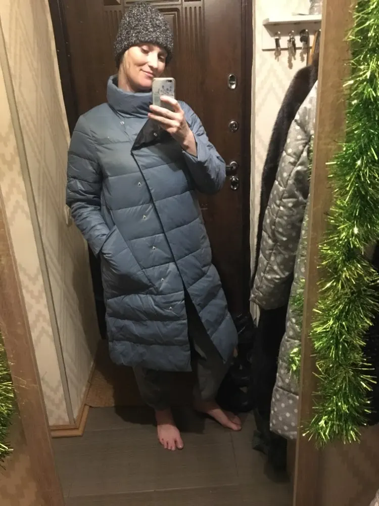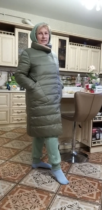 Мои параметры 88-71-91, рост 167 см. Размер XL отлично подошел. Рукав хотелось бы чуть подлиннее, но и так хорошо. Место под кофту есть. Сидит свободно. Люблю такие легкие пуховики на пуху. В минус 12 с ветром надела под него легкую кофту, толстовку теплую, лосины с начесом, юбку. Если по полчаса на остановках не стоять, замерзнуть в этом всем не успеваешь. До минус 7 спокойно в нем можно ходить. Погладила утюгом налицо без марли - все нормально. Ниток торчащих почти нет. Цвет приглушенный, пыльный голубой. Конечно, более плотные пуховики будут теплее, на зато от такого пухана не устаешь. У меня от других теплых объемных пуховиков плечи начинают болеть и неудобно в них. Пришел за месяц после 11.11 в объединенной посылке.