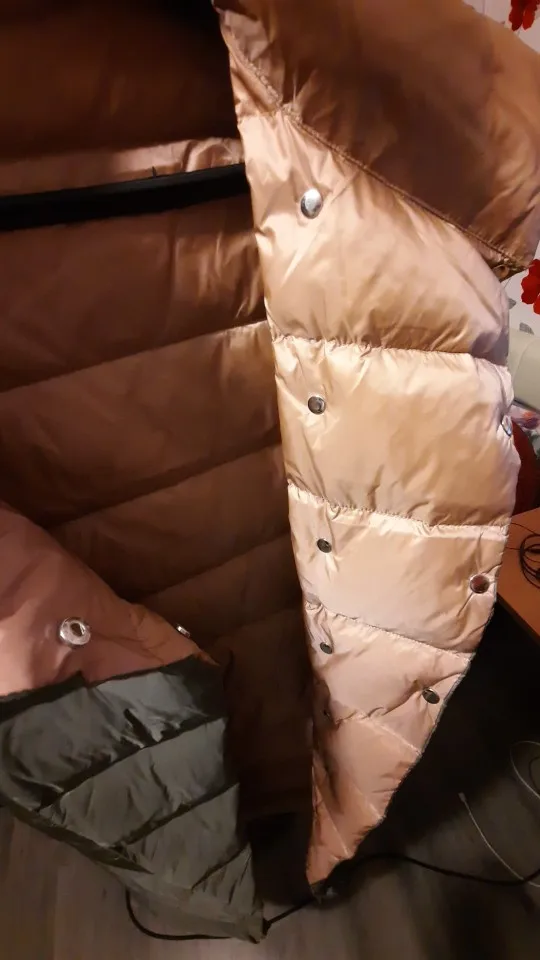 отличное пальто-пуховик. пришел немного сплющенный, но думаю повисит - наполнитель станет более объёмным. швы ровные, нитки не торчат, запаха нет. на ог 98, об 100 xxl подошёл, вполне можно с тёплым свитером. по температуре - думаю, Краснодарскую зиму до 0 градусов перенесёт:-) продавец молодец, общительный, я попросила и он сделал все, чтобы отправить быстрее в пиковый сезон - брала 11.11, пришел 28.11 в Краснодар. на рыжую сторону носить буду вряд ли- несмотря на качественную отделку, все-таки швы торчат. но кого это не смущает, могут носить- кнопки и карманы для второй стороны есть. в подарок положили резиночку