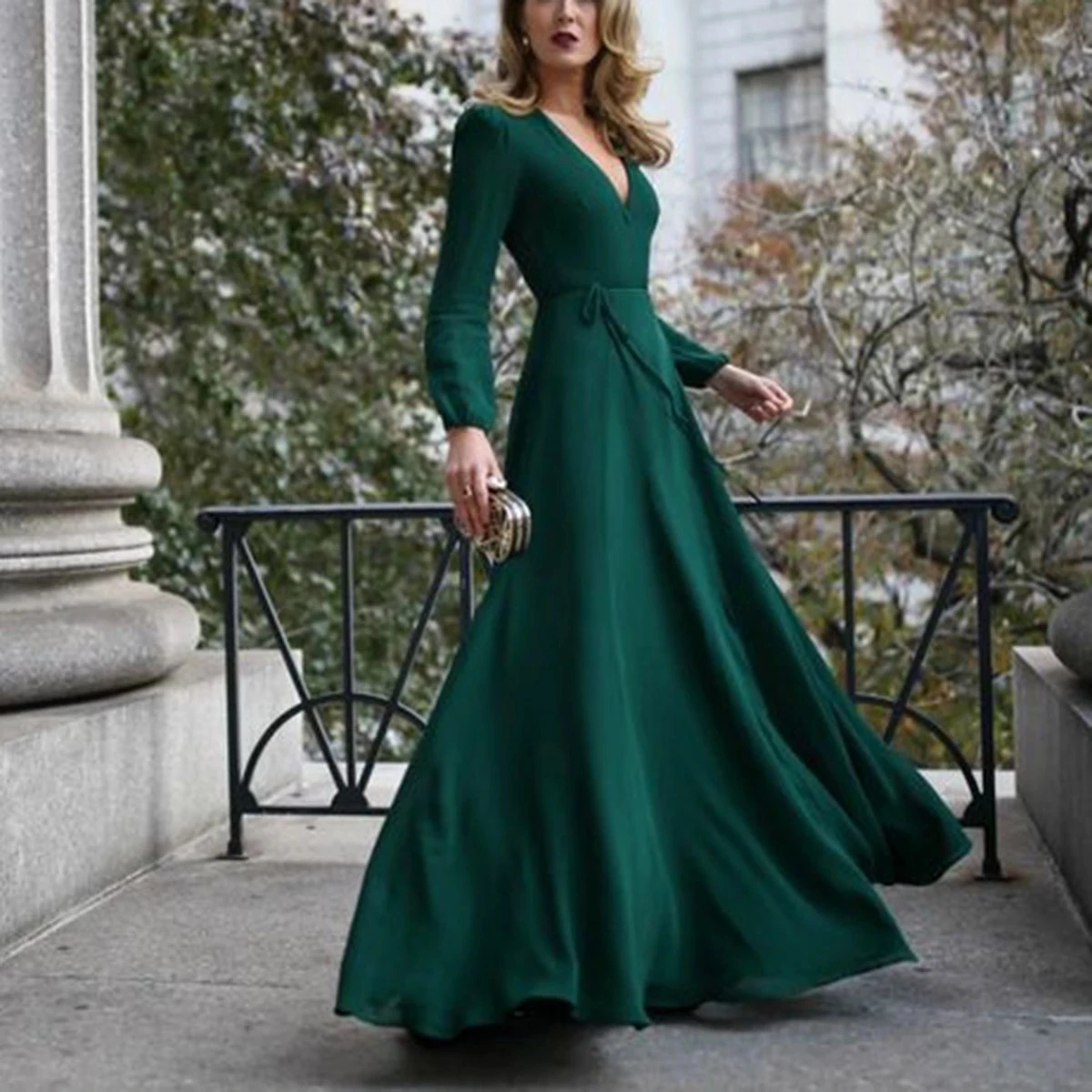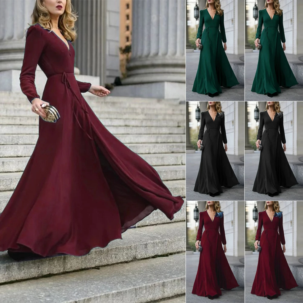 Женское платье-макси с V-образным вырезом, длинным рукавом