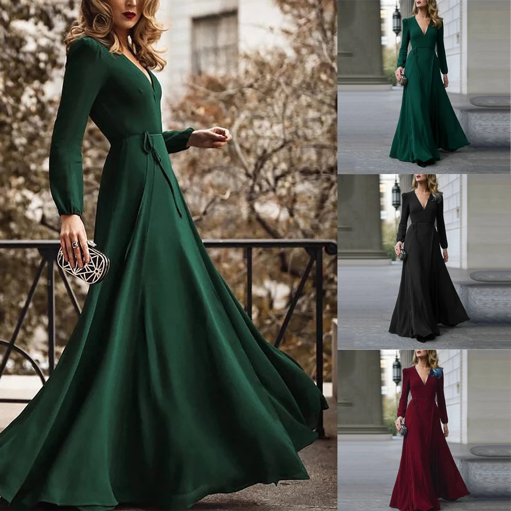 Женское длинное вечернее платье с поясом, однотонное облегающее Платье макси с V-образным вырезом и длинным рукавом, для клуба и вечеринки
