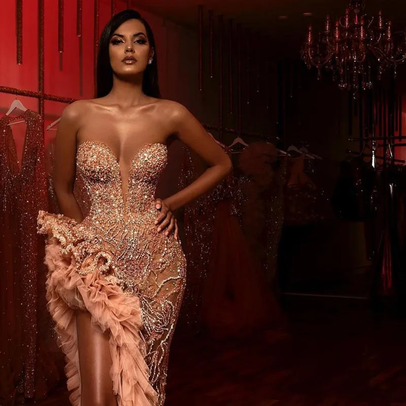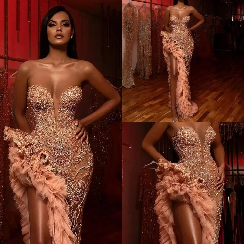 Персиковое Русалка пикантные вечерние платья для выпускного 2020 robe de soiree, украшенное бисером с большим разрезом, с открытыми плечами, великолепные арабские вечерние платья в строгом стиле