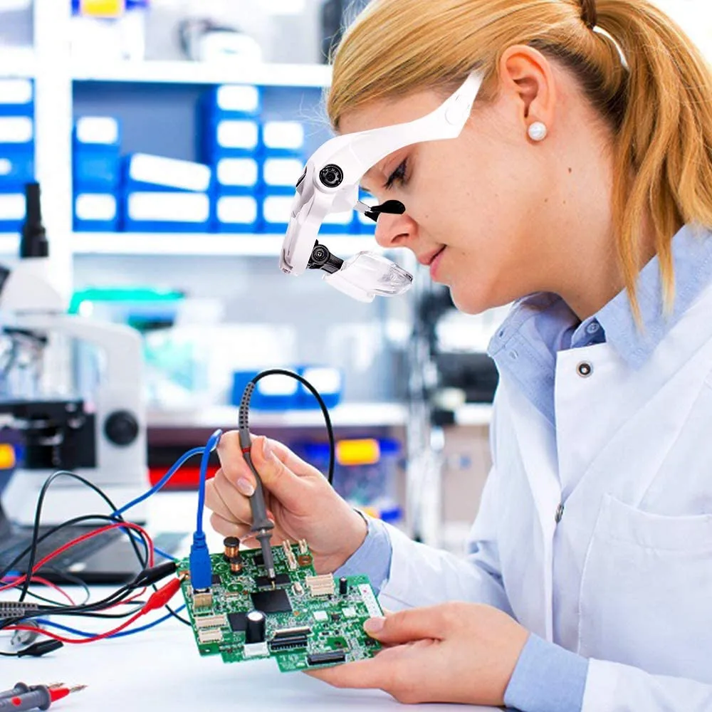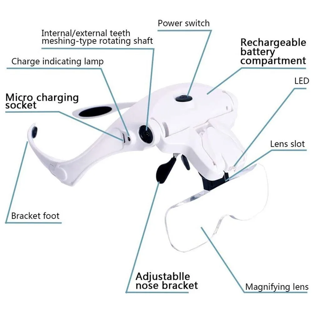 Эффективные аккумуляторные батареи: Попрощайтесь с тяжелыми очками с увеличительным стеклом! Головная Лупа с доской сохраняет электричество вместо традиционных батарей, что делает увеличительное стекло легче и дает вам более удобный пробный опыт.Удобный usb-интерфейс зарядки: Нет необходимости заменять аккумулятор, просто заполните его через час! Usb-интерфейс для зарядки более удобен и экологичен. Вы можете питаться напрямую через usb-интерфейс. Время зарядки в течение одного часа обеспечивает до 8 часов рабочего времени для перезаряжаемых батарей.5 различных увеличительных линз для близкой работы: оголовье увеличительное стекло обеспечивает пять увеличений 1X, 1.5X, 2X, 2.5X, 3.5X. Размер объекта можно наблюдать, чтобы выбрать необходимые линзы, такие как шитье, работа с иглой, вязание, вышивка крестиком, вышивка и т. Д.Гибкий и удобный держатель для мостика: Защитите нос! Держатель для носомостика с увеличительным стеклом без рук регулируется, вы можете настроить его в соответствии с вашими потребностями.Эффективные аккумуляторы и носоупоры с мягким резиновым покрытием могут значительно облегчить нагрузку на переносицу. Положите нос в более расслабленное рабочее положение!Регулируемый светодиодный светильник из стекла: светодиодный светильник обеспечивает достаточную яркость в любых темных или тусклых условиях, что позволяет лучше видеть мелкие вещи ночью. Вы можете легко включить или выключить светильник с помощью переключателя. Как угол обзора объектива и светильник ning угол может быть всем необходимым для того, чтобы удостовериться в том, что светильник излучает поверхность рассматривать объект точно.Случайные цвета не могут быть выбраны