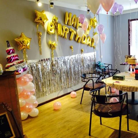 Декорации вечерние, занавески, пастельные шары, белые цифры, розово...