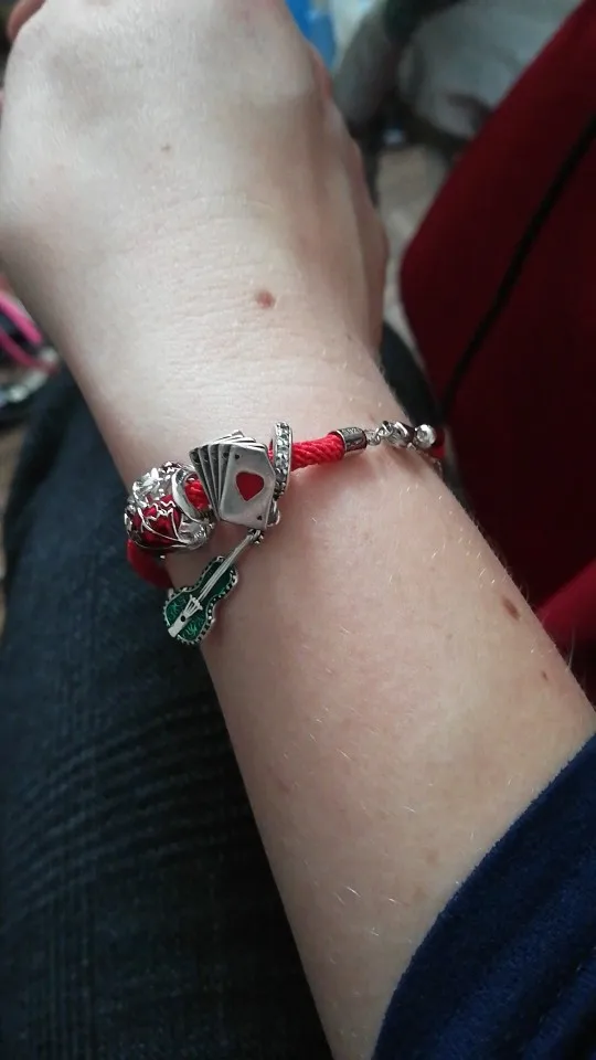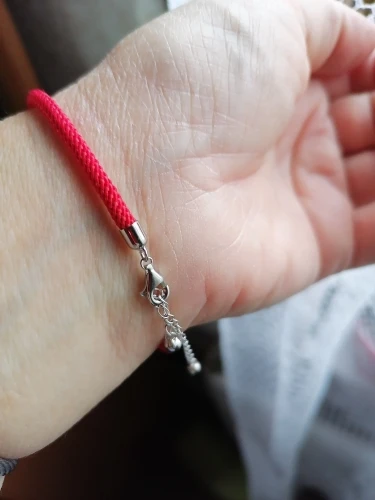 Браслет не такой толстый, как на фото. Подвески очень свободные и легко перемещаются с одного конца на другой. Красная Нить измеряется всего 16 см. Если продавец укажет это. Серебряная цепочка очень тонкая и застежка очень маленькая. Тем не менее, это красиво, это хорошо сделано. Я надеюсь, что это длится, потому что мне кажется высокой стоимостью для такого простого браслета. У меня не было проблем с продавцом. Продавец отправил товар быстро. Спасибо.