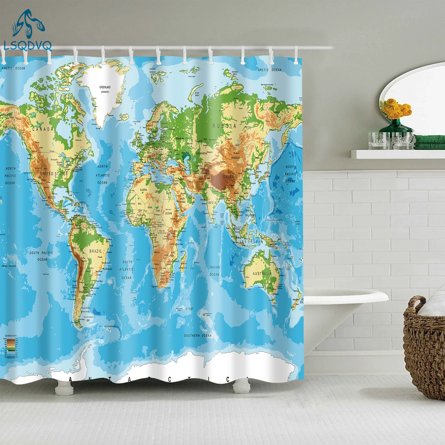 Декоративная занавеска для душа с изображением карты мира, животных...