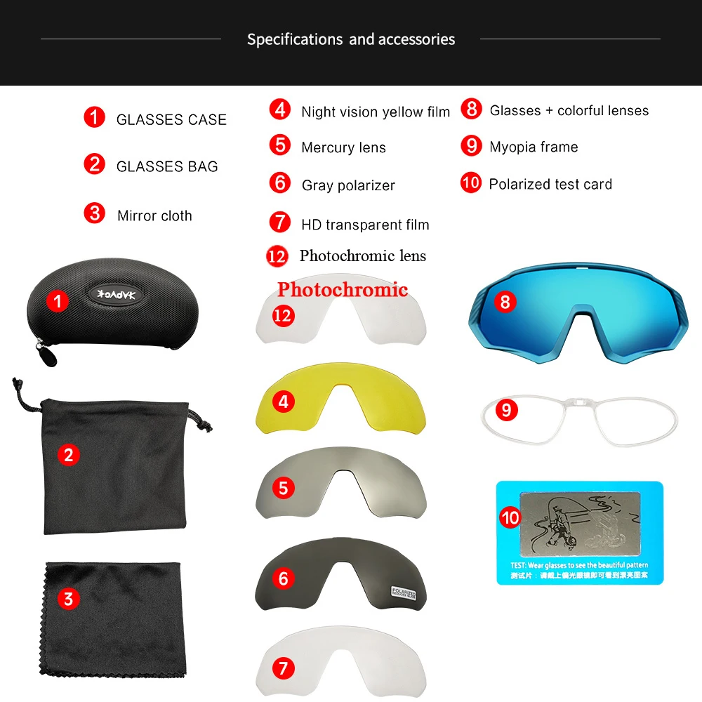 Вы можете получить 6 линз:Фотохромные линзы * 1Поляризованные линзы * 1Цветные линзы * 1Желтый объектив ночного видения * 1Серебристые линзы в золотистой оправе * 1Прозрачные линзы HD * 1