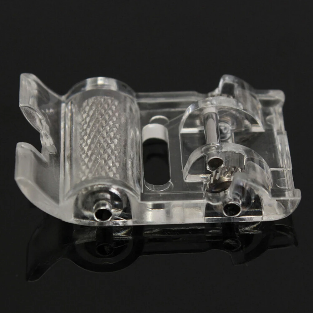 Лапка изготовлена из прозрачного пластика с металлическими роликами. Это помогает питать ткань и предотвратить поломку иглы, поломку нити, смещение или пропущенные стежки, вызванные вытягиванием ткани