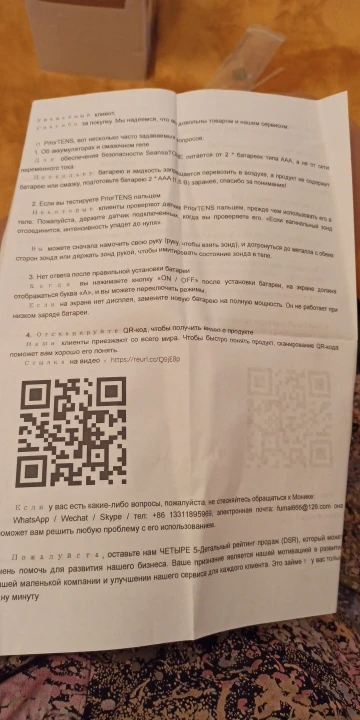 На английском нет инструкции. Есть запах пластика. Режимы все работают. Всё целое. Проводок очень тонкий. Камерой все перевелось вполне понятно все на простом языке написано. Все было в комплекте. Пришло в коробке без доп упаковки. Вес всего 116 грамм. Все данные как номер поддержки, страна изготовления - есть, но не владея англ, не смогла позвонить и уточнить на самом ли деле там изготовили или это обычный паленый Китай. Пришло за неделю в СПб. Отзывы отпишу ещё раз после более длительного срока использования. Пока, большие сомнения по поводу работы. Надеюсь, что хотя бы частично начнёт решать проблемы. Думаю, на среднем режиме интенсивности вполне будет достаточно, поскольку все что выше уже очень ощутимо даже на коже рук. Микро токи ощущаются, передаются чрез две боковые металпластины. Не представляю как оно рабоатет и будкт ли польза за 2000. Работает от двух мизинчиковых батареек. Насколько поняла если у пластин нет контакта с Кожей, то прибор отключается.