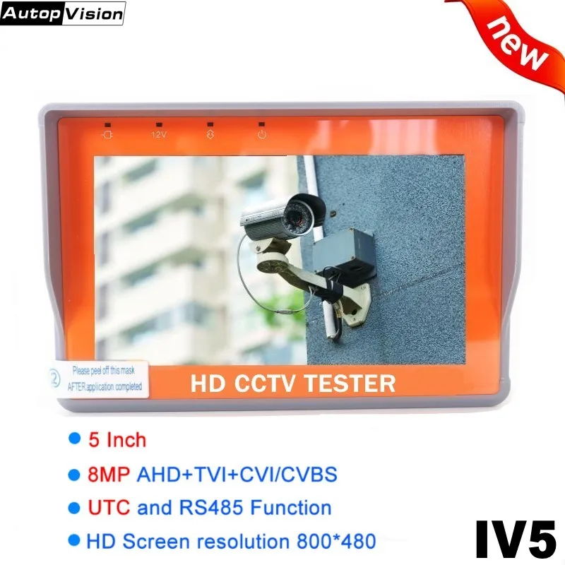 Поддержка IV5:8 МПТестер камеры,5 дюймовРазрешение экрана HD 800*480, поддержка 8MP AHD + 8MP TVI + 8MP CVI / CVBS видео тестер,UTC(HD коаксиальный контроль, BNC коаксиальный контроль PTZ, но не может вызвать информацию о меню камеры) и функции RS485 и UTP.