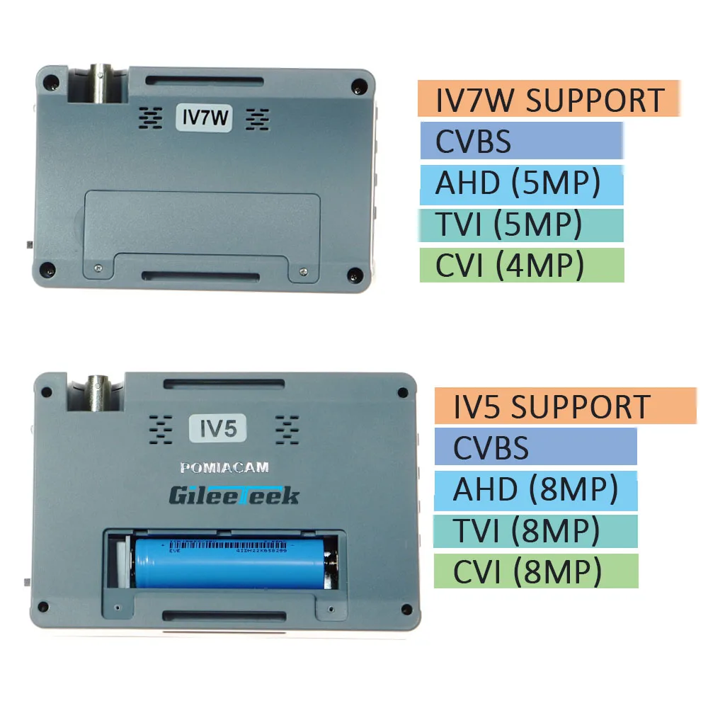 IV7WПоддержка CVBS + AHD (5MP) + TVI (5MP) + CVI (4MP)4,3 дюймовВидеотест камеры: