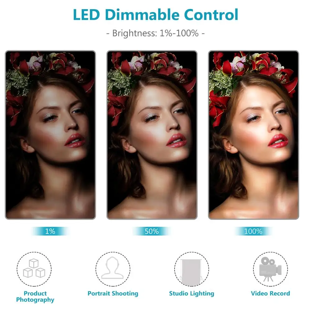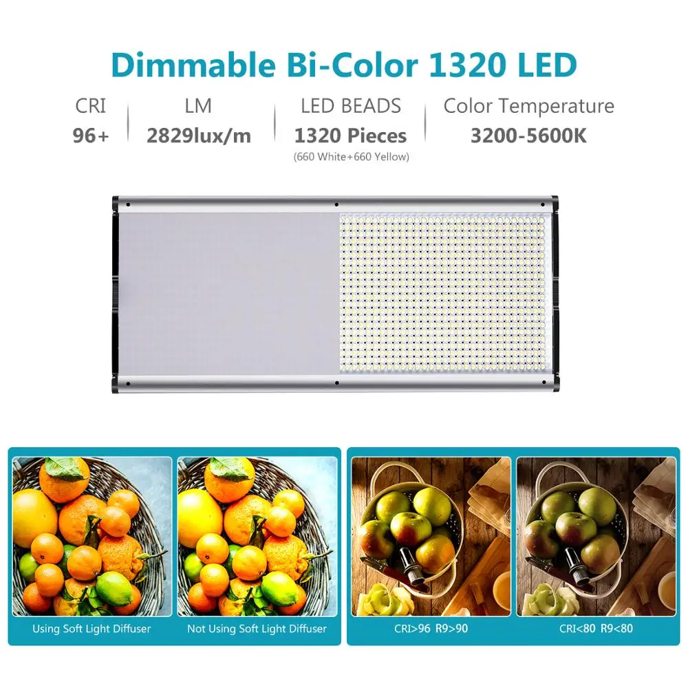1320 двухцветных светодиодных лампочек:С 1320 индивидуальсветодиодный светодиодными лампами с длительным сроком службы и высокой яркостью (660 белый + 660 желтый) и яркостью можно регулировать, он светит ровным и стабильным светильник вым потоком. CRI 96 + может восстановить истинный цвет портретов, пейзажей и предметов идеально