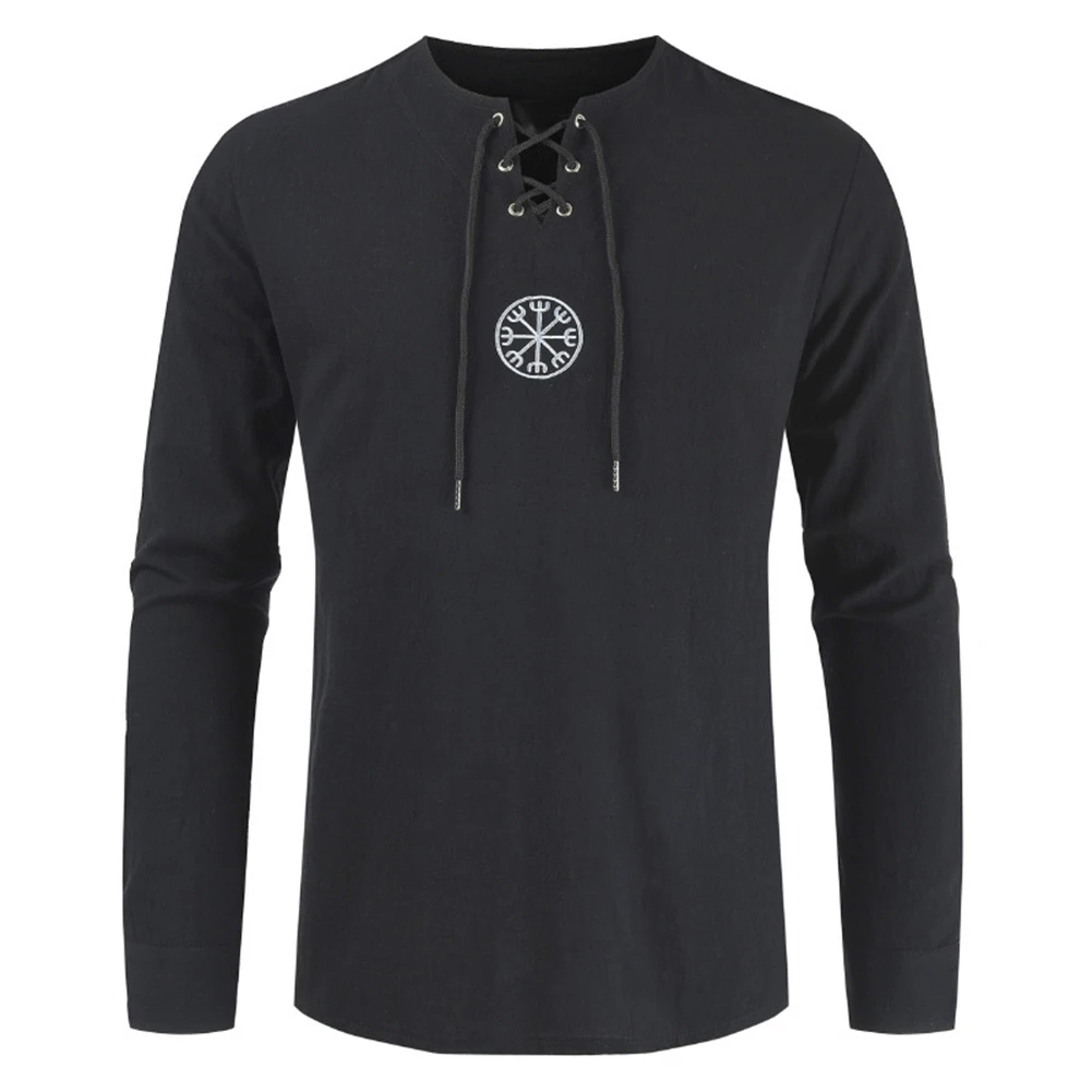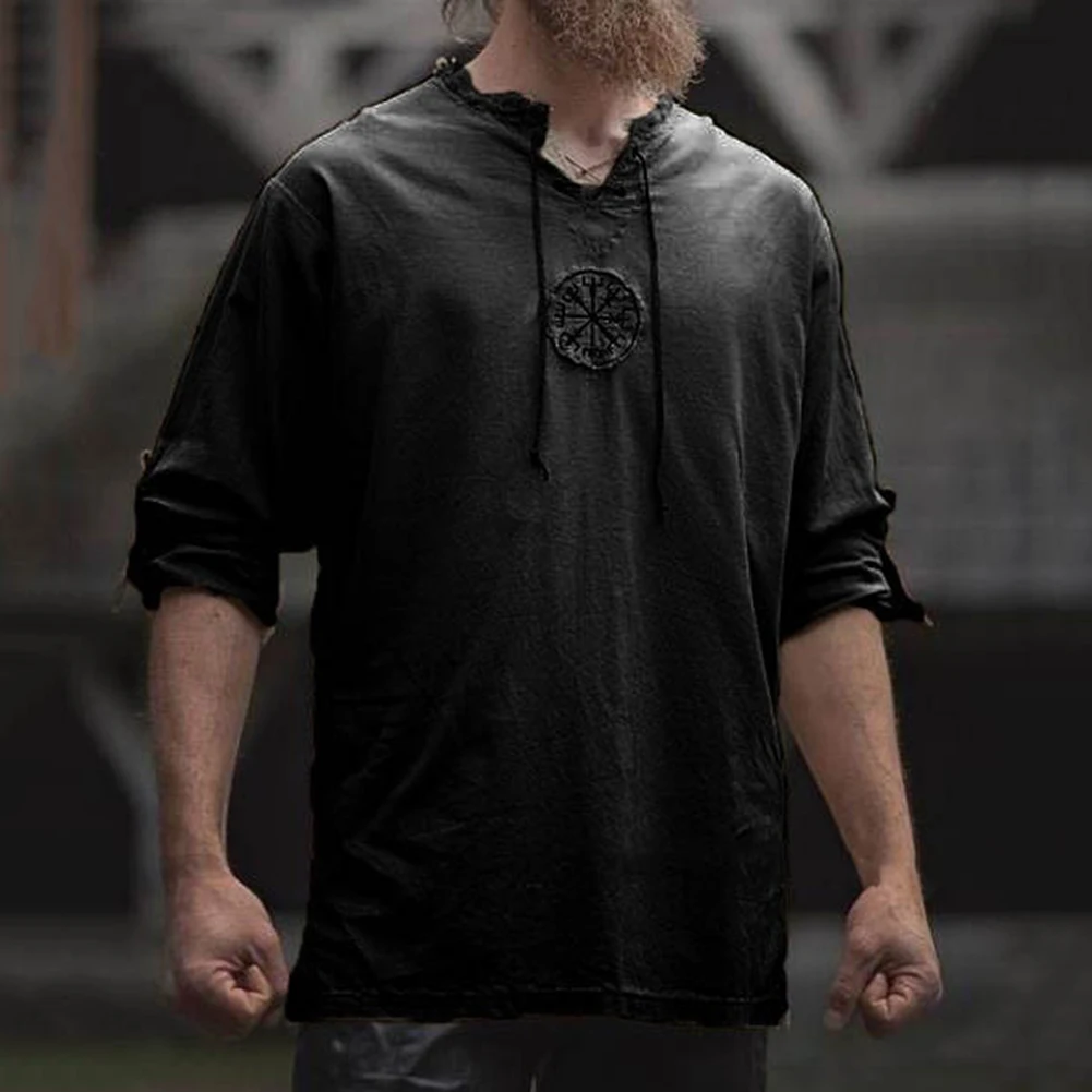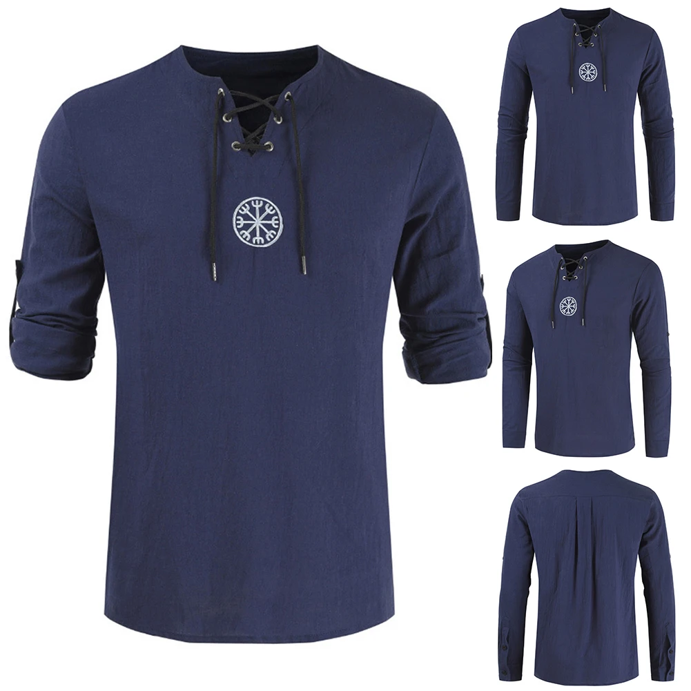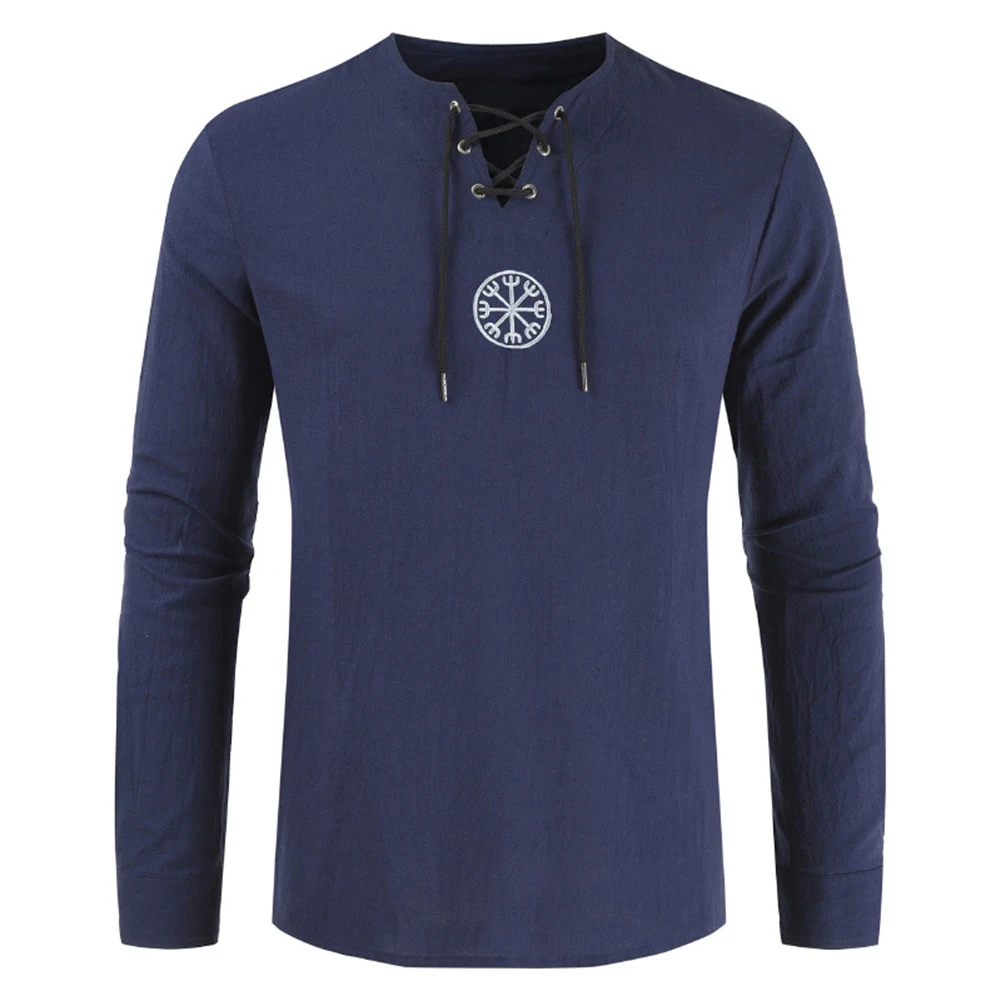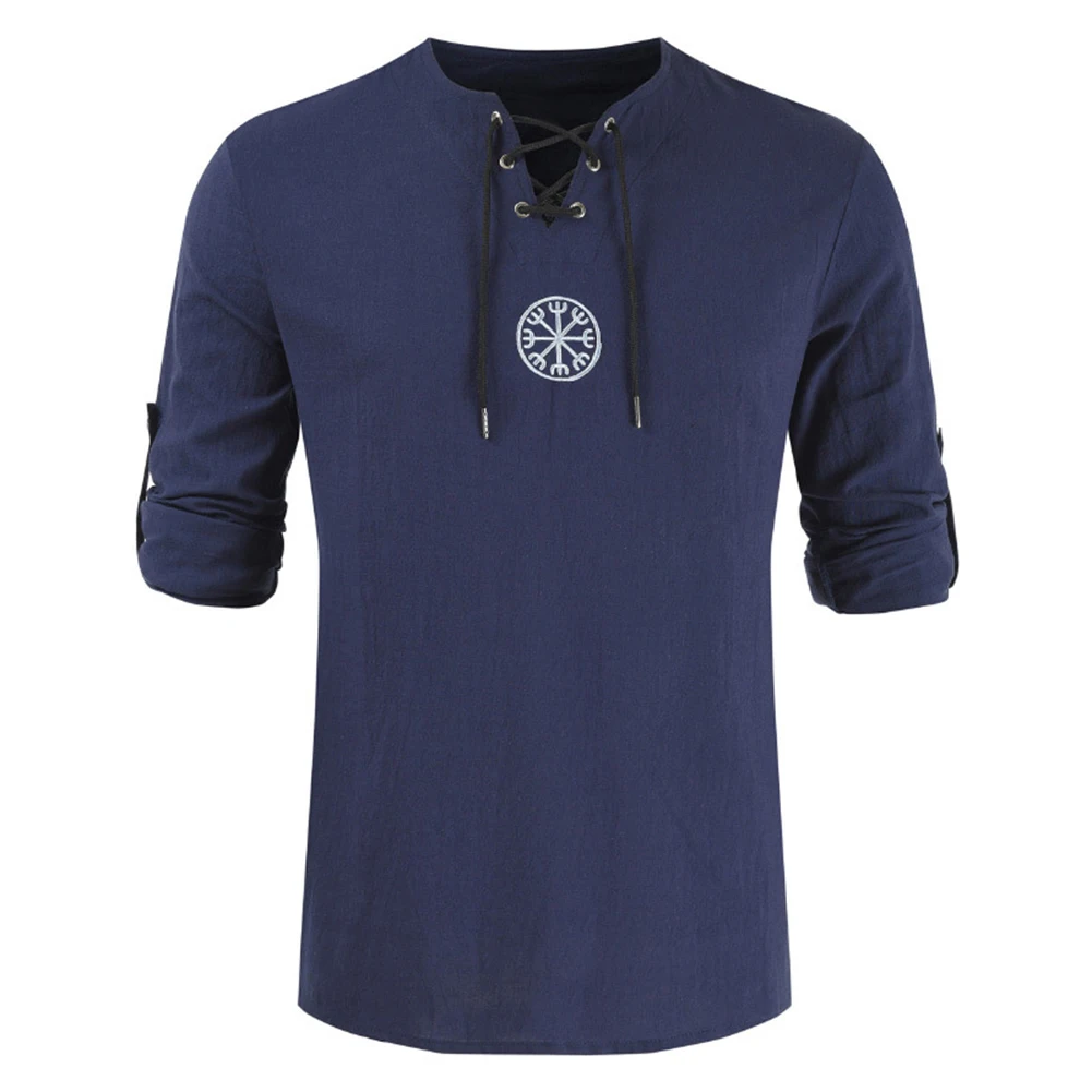 Мужская рубашка с длинным рукавом, с вышивкой викингов, на шнуровке, с V-образным вырезом, размера плюс