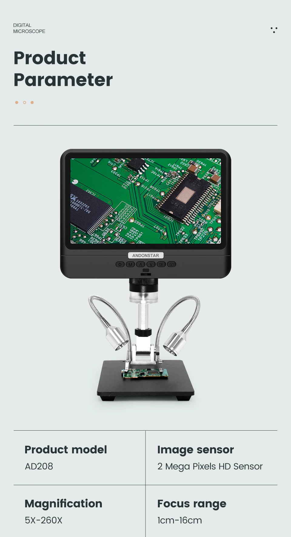 ОсобенностиПараметры цифрового микроскопа AD206Датчик изображения: 2 Мегапикселя HD СенсорВидеовыход: FHD 1920x1080 30 кадров в секунду; 1080P 1440x1080 30 кадров в секунду; 720P 1280x720 30 кадров в секунду;Формат видео: AVIУвеличение: до 200 разРазрешение фото: макс. 12 м (4032x3024)Формат фото: JPGДиапазон фокусировки: 2-17 смЧастота кадров: Макс 30f/sХранение: карта Micro-SD, до 64GПоддержка ПК: нетИсточник питания: 5 В постоянного токаСветильник источник: 2 светодиодный с подставкойРазмер экрана: 7 дюймовРазмер стойки: 20 см * 12 см * 19 смСертификация: CE/FCC/ROHSПосылка:Микроскоп × 1 металлический стандарт × 1Инструкции × 1 ИК-пульт × 1Кабель-переключатель × 1 адаптер питания × 1УФ-фильтр × 1 крышка объектива × 1Упаковочные данные: 32*22*10 см/1,4 кгГарантия: 1 год