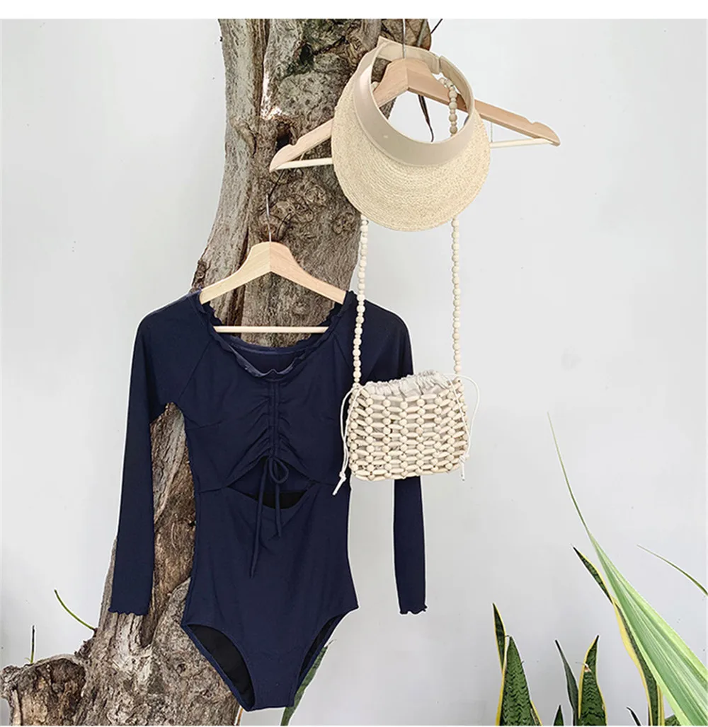 Цельный купальник с длинным рукавом, Женский однотонный купальник, сексуальный Монокини с вырезами, купальник пуш-ап, трикини в Корейском стиле