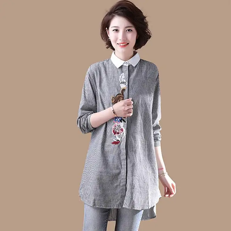 Длинная рубашка, женская блузка в полоску, с вышивкой, повседневная, из хлопка и льна, размера плюс