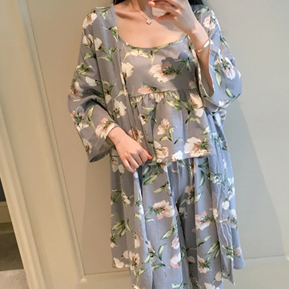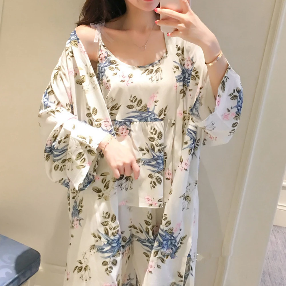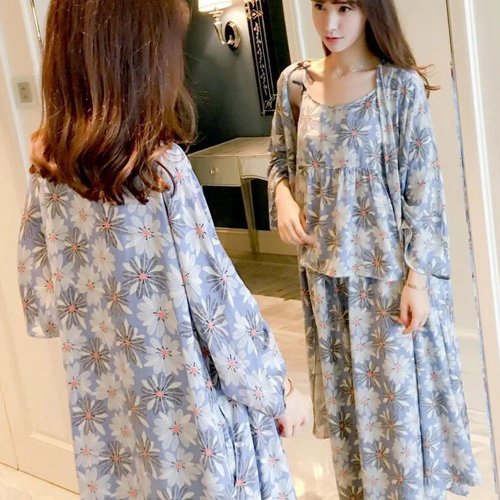 Комплект для сна Женский, из 3 предметов, Кардиган с длинным рукавом и цветочным принтом, длинные штаны, мягкий, приятный для кожи