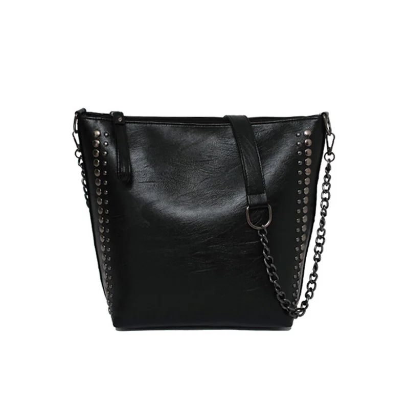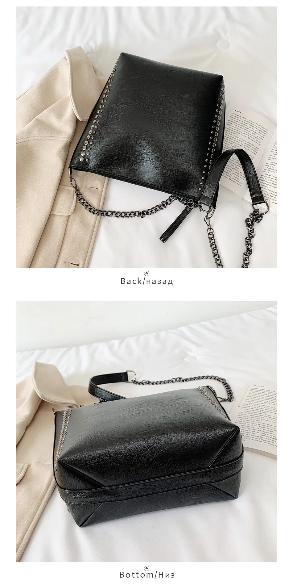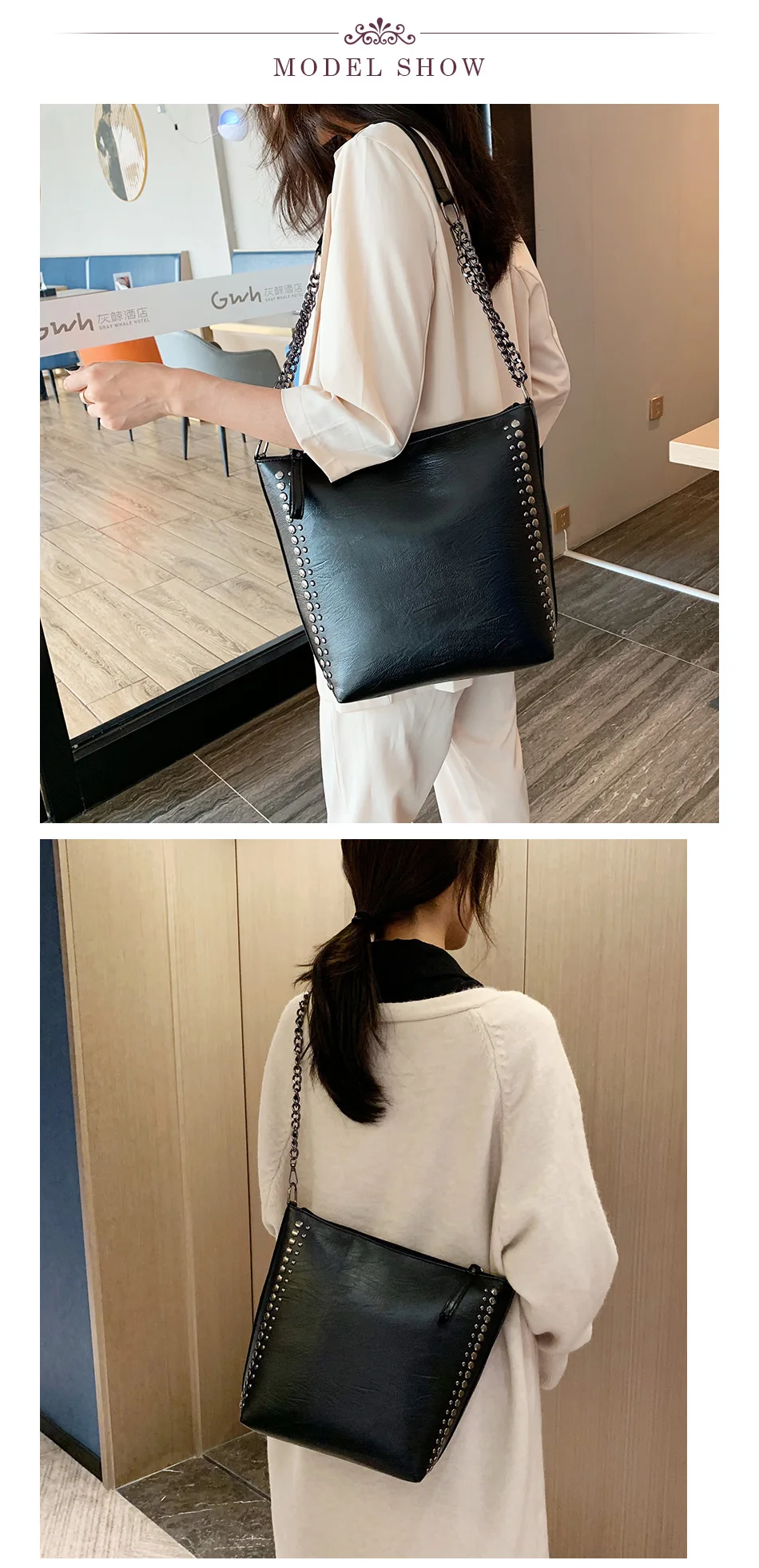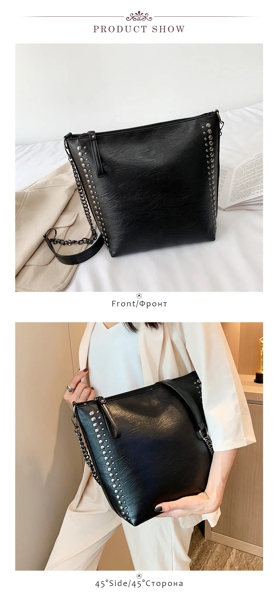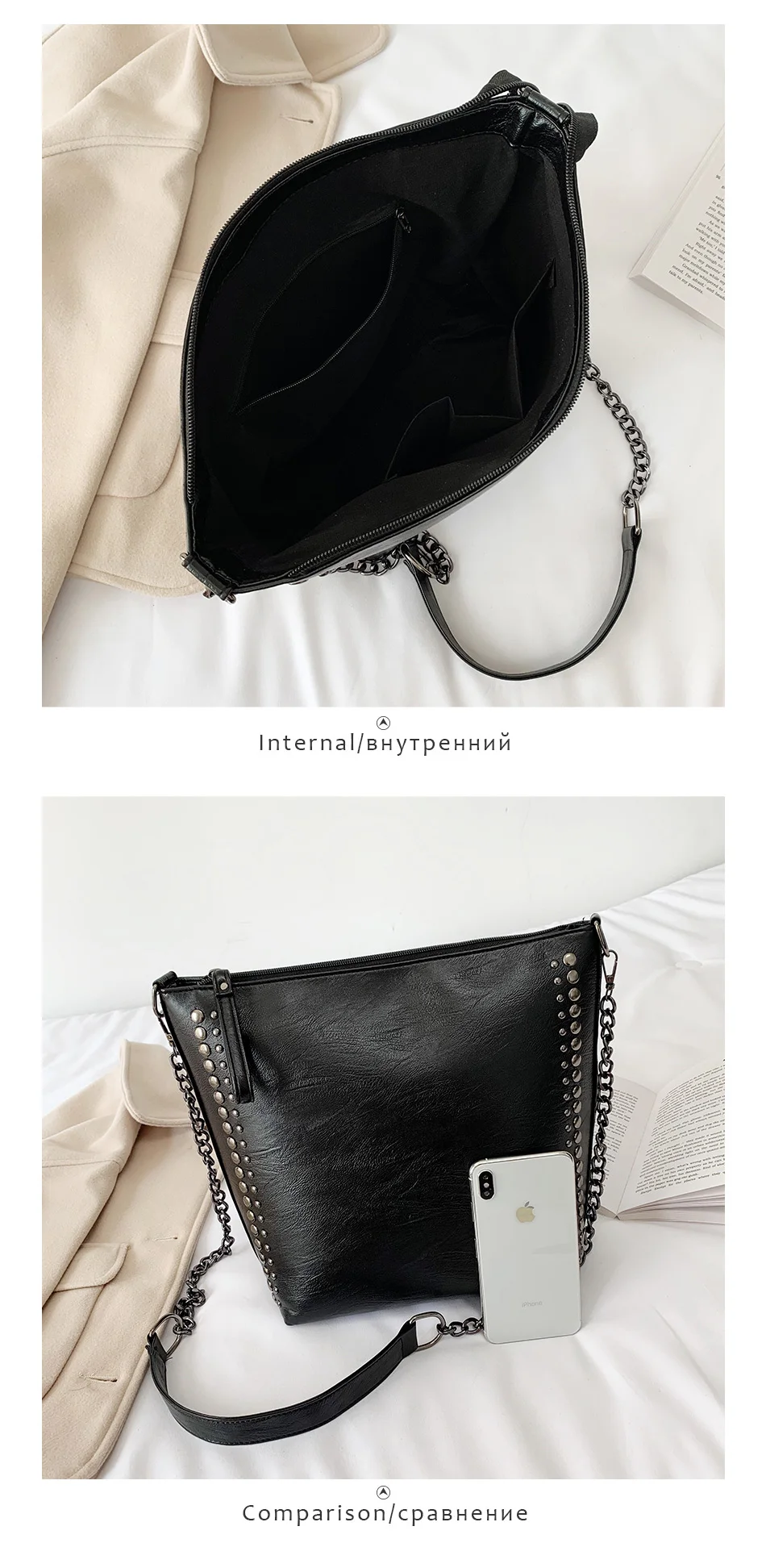 Новинка 2019, сумка-мешок с заклепками, Женская Повседневная сумка с цепочкой, женская большая сумка через плечо, женская кожаная сумка на молнии