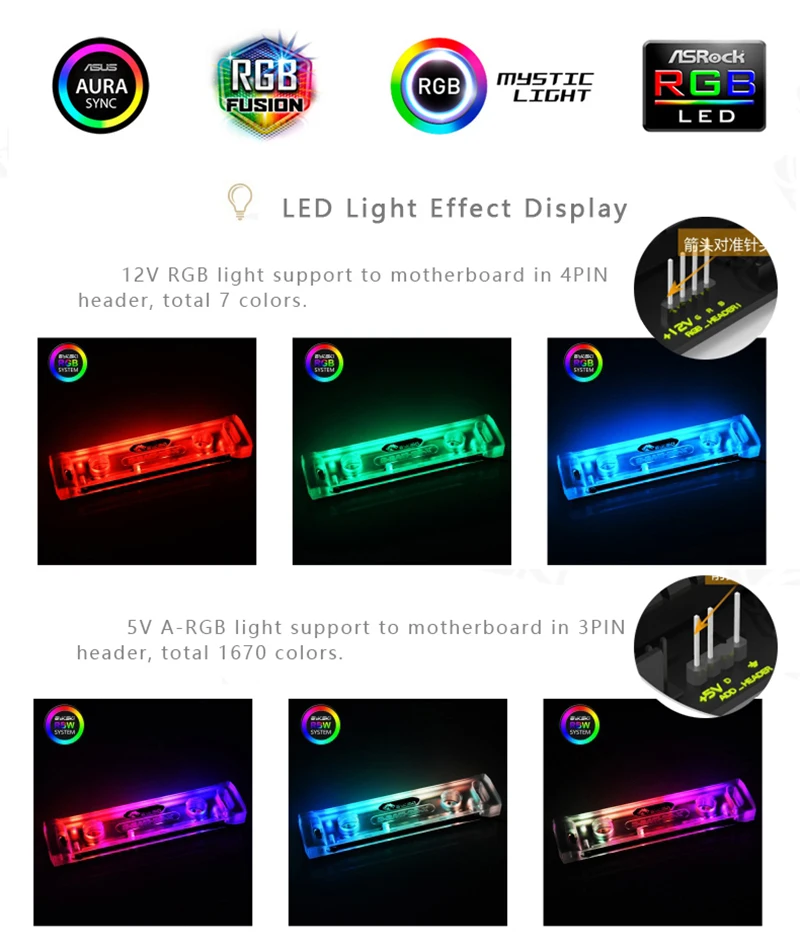 1. Блок водяного охлаждения RAM 2. Металлическая крышка RAM 3. Используется для двухканальной ОЗУ 2 шт. 4. Возможность настроить два вида полосы: 4PIN 12V RGB или 3PIN 5V D-RGB