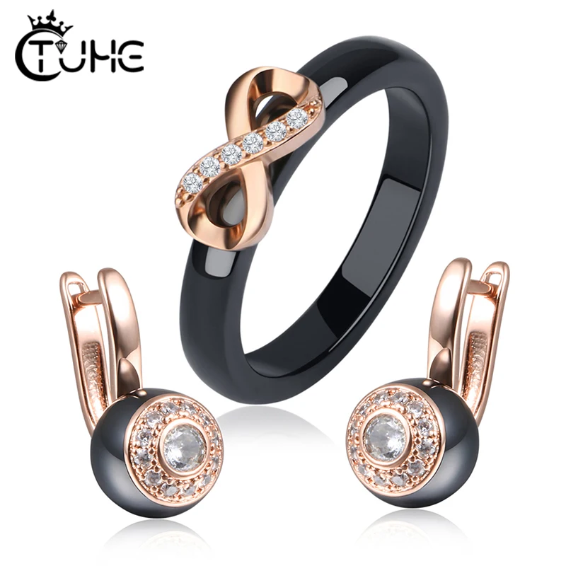 Набор женских керамических украшений, серьги-гвоздики под розовое золото циркониевые керамические кольца пробы