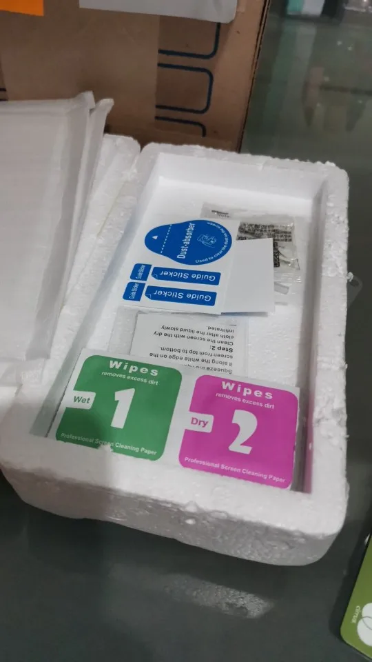 Очень быстрая доставка до Омска, около 2-3 недель. Стекла приехали целые, с каждым стеклом салфетки, липучки для удаления пыли и жижа для обработки краёв стекла. Экран немного желтит с этим стеклом, через день привыкаешь и уже не замечаешь этого. Надеюсь правда снижает нагрузку на глаза.