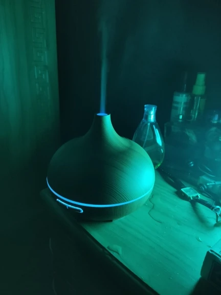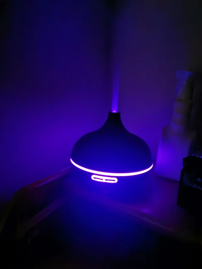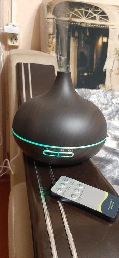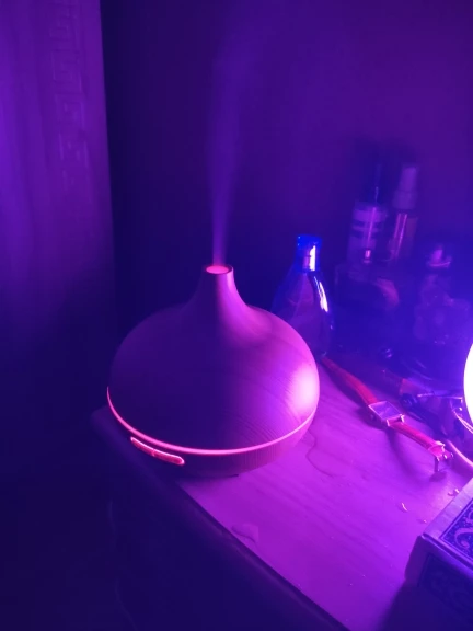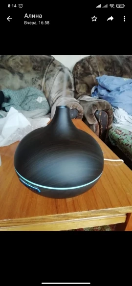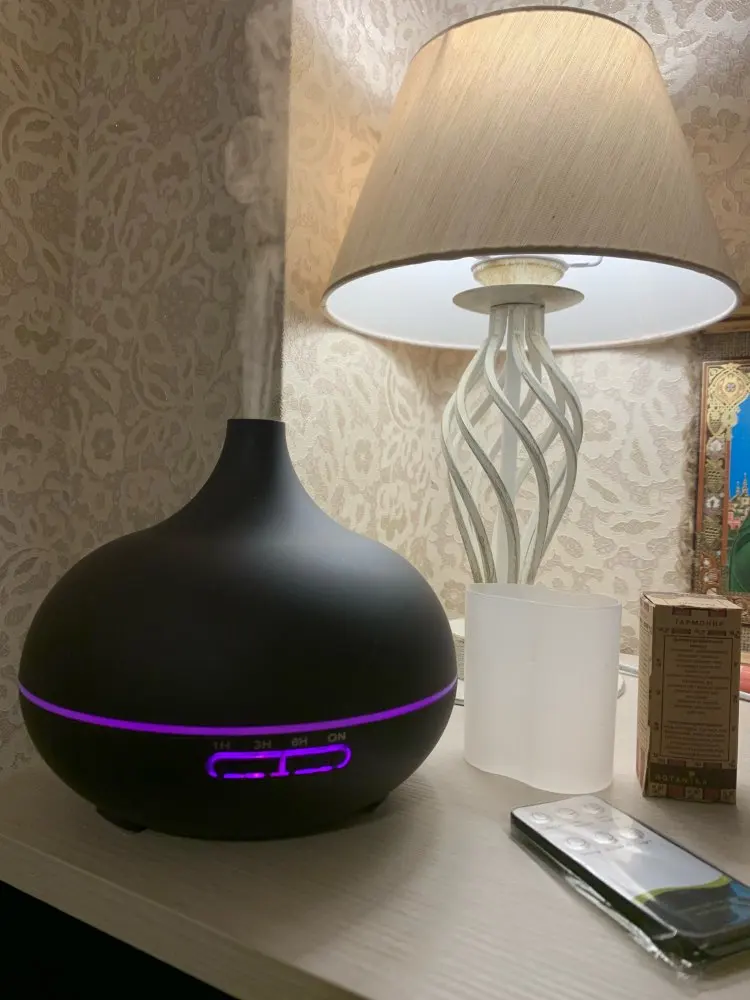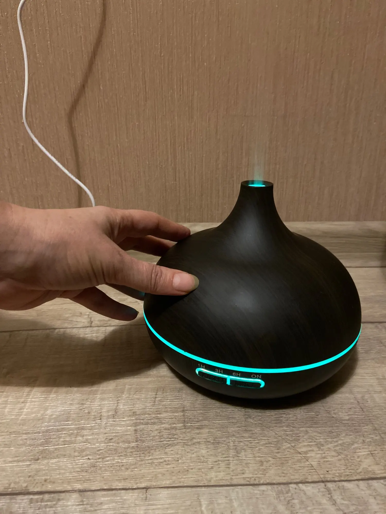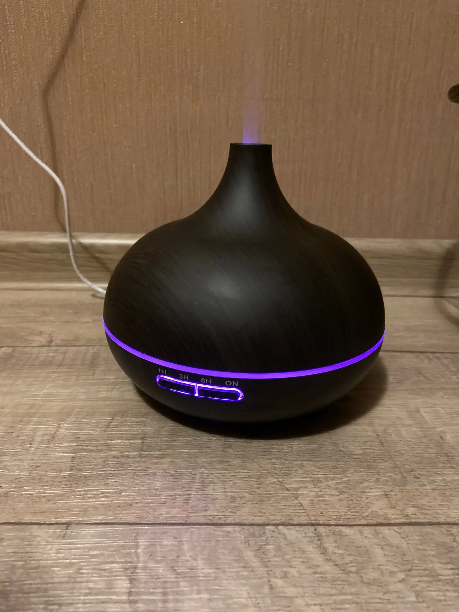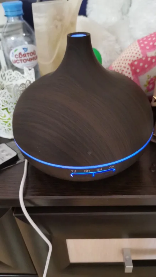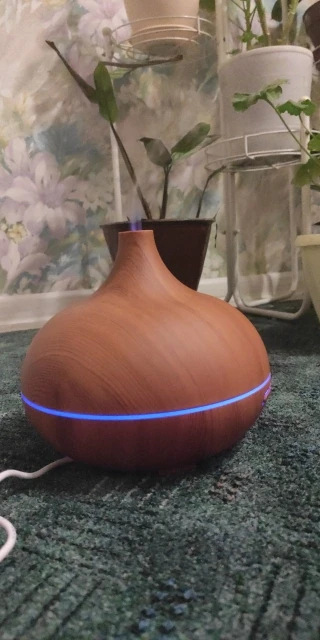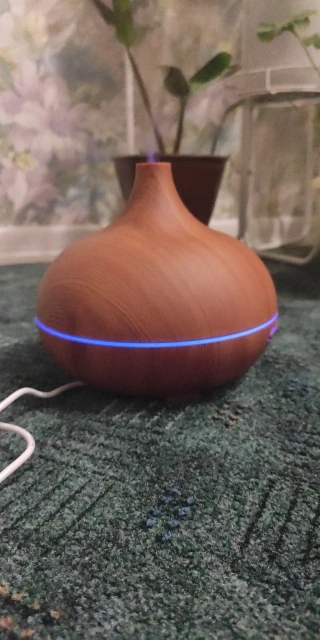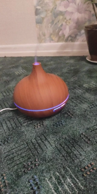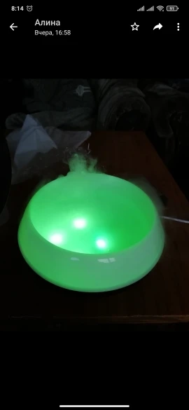 классный диффузор, дошел быстро. классно что можно карать эфирные масла. объем хороший. работает достаточно тихо,но ночью естественно слышно,но быстро привыкаешь. единственное светиться в темноте достаточно ярко. меняет цвет подсветки.