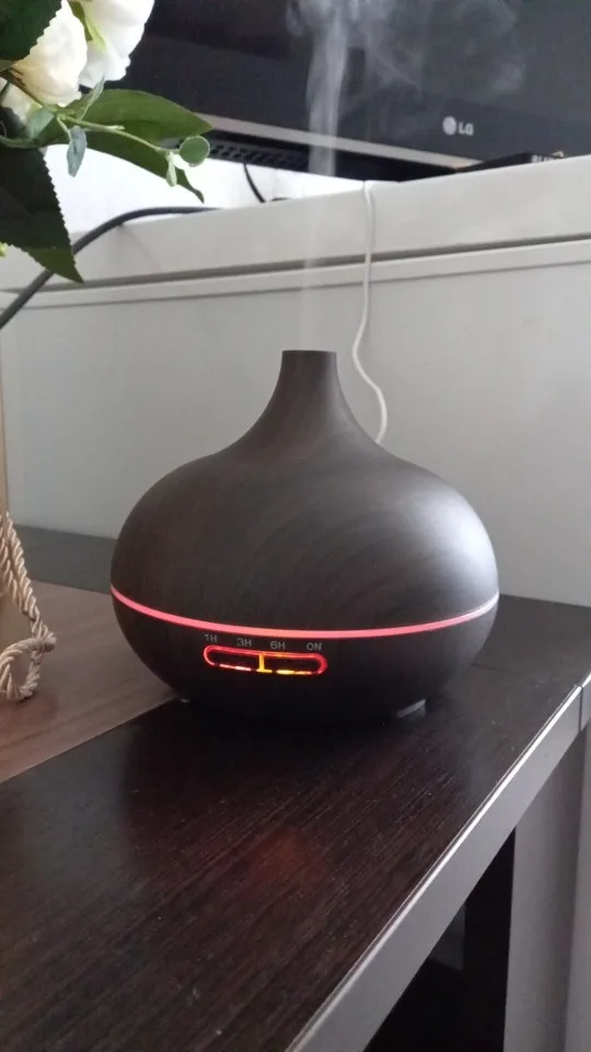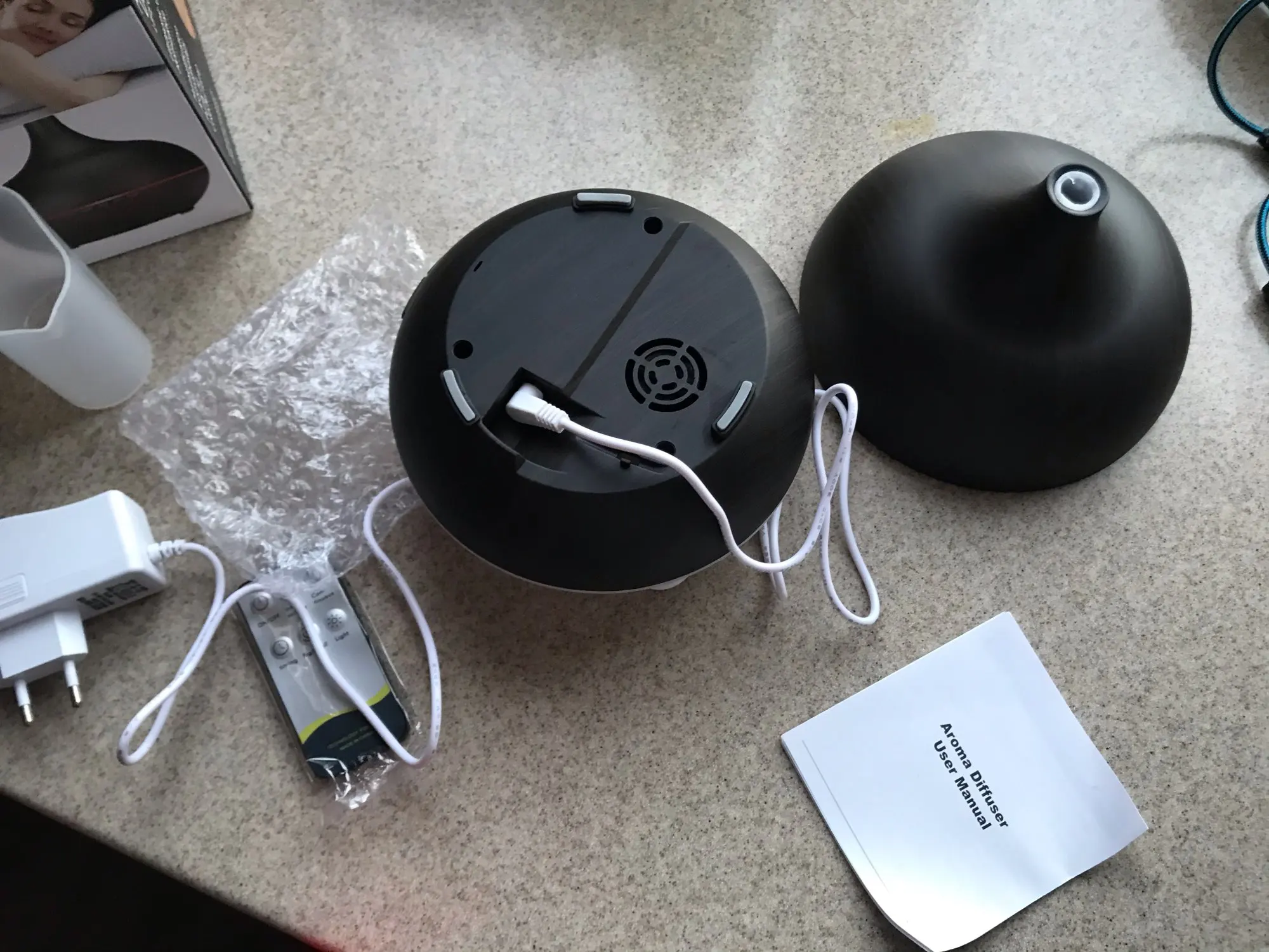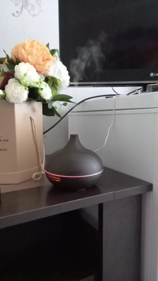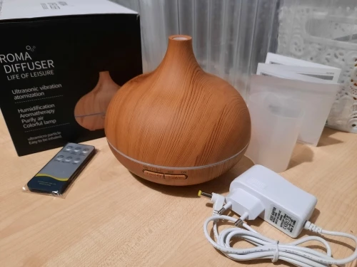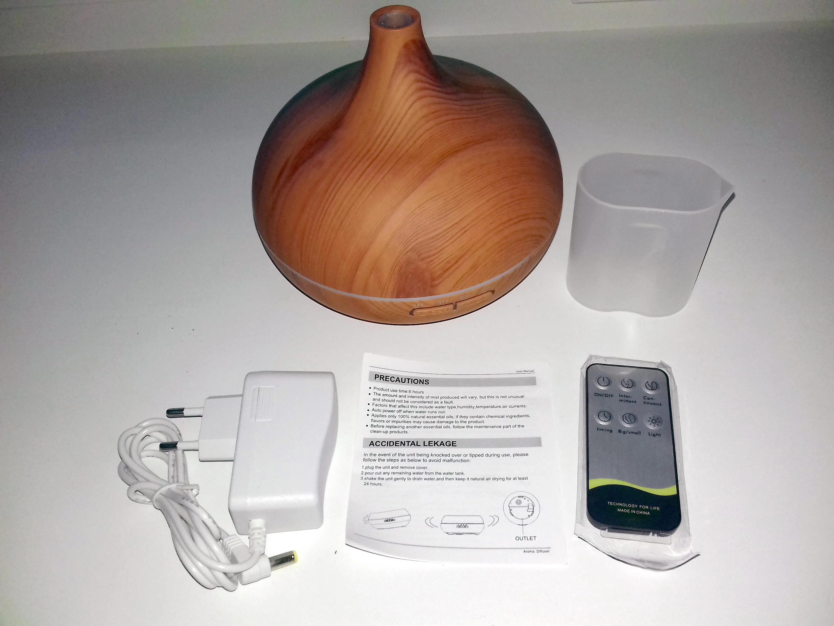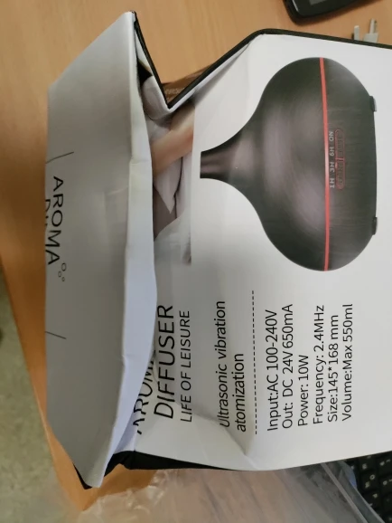 Шёл до Мск почти 1,5 месяца. Упакован был хорошо, но сама коробка диффузора была помята. Благо, ничего не сломано и все работает исправно. Прилагалась инструкция по применению на англ. языке. Довольно много важной информации. Сам диффузор небольшой. Увлажнения от него минимум, но как аромолампа отлично подойдёт. Шнур розетки всего 1,5 м длиной. На мой взгляд коротковат. Придётся выкручиваться и думать куда поставить, чтобы был подальше от стены, но при этом близко к розетке. Работает как через кнопки, так и через пульт. Есть несколько режимов испарения как по интенсивности, так и по времени, а также 20 режимов света. После истечения выбранного времени или воды, автоматически отключается. При добавлении эфирных масел следует быть аккуратным. Запах довольно быстро распространяется по комнате. Если переборщить с маслом, может заболеть голова. При работе присутствует небольшой гул. Но к нему быстро привыкаешь и не обращаешь внимания.