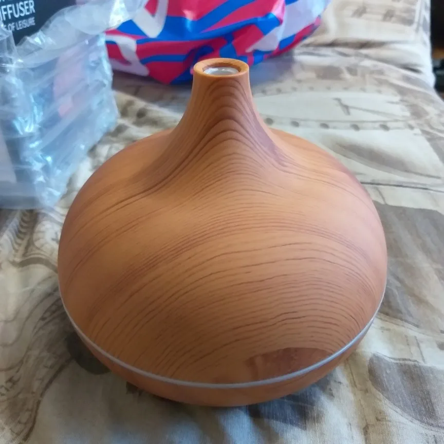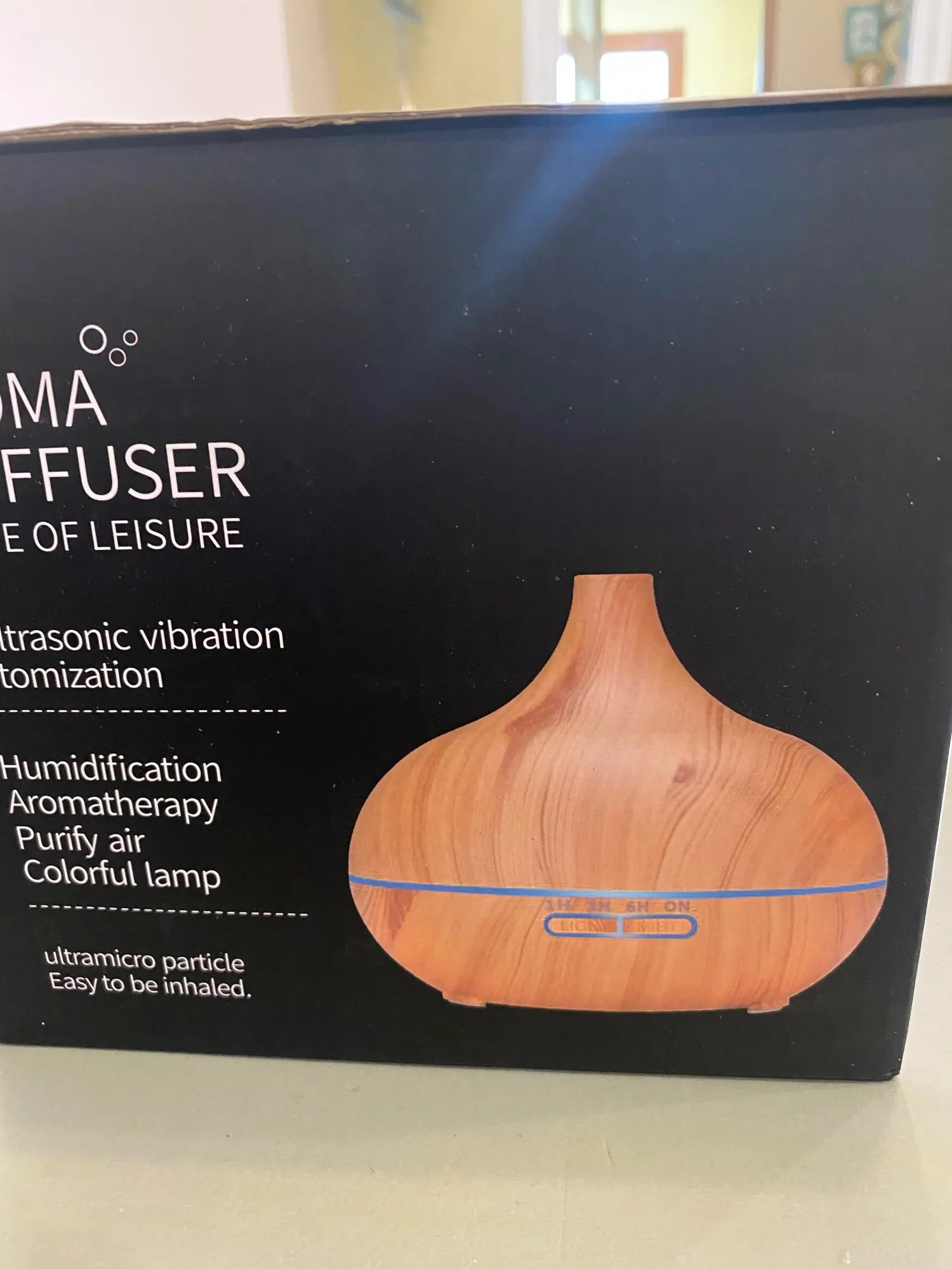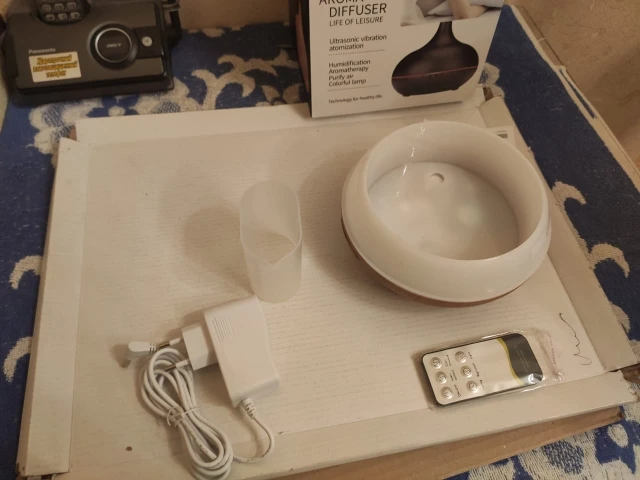 Симпатичный диффузор. Объем достаточно большой. Есть регулировка интенсивности испарения воды и регулировка цвета подсветки. Так же в наличии пульт управления. На нем есть таймер. Пока не разобралась, что каждая кнопка означает. Пришел упакованный в мягкую дутую пленку. Коробка немного помята, но внутри все целое.