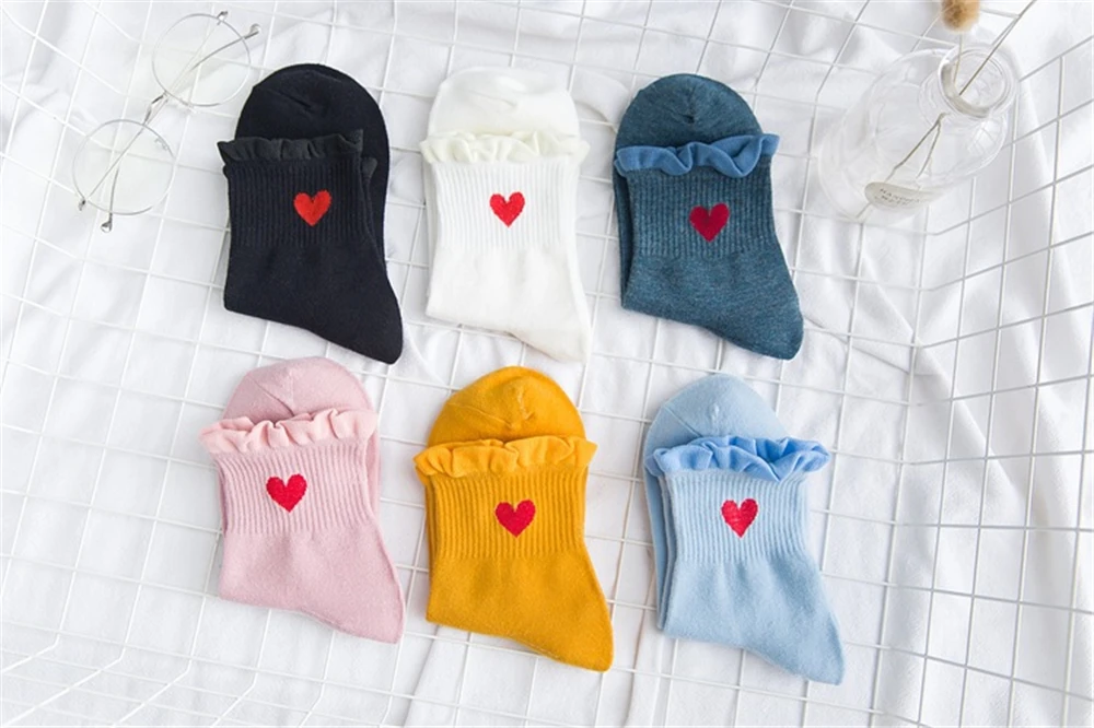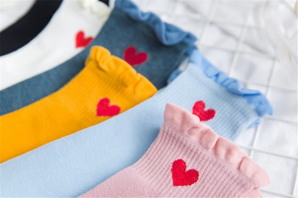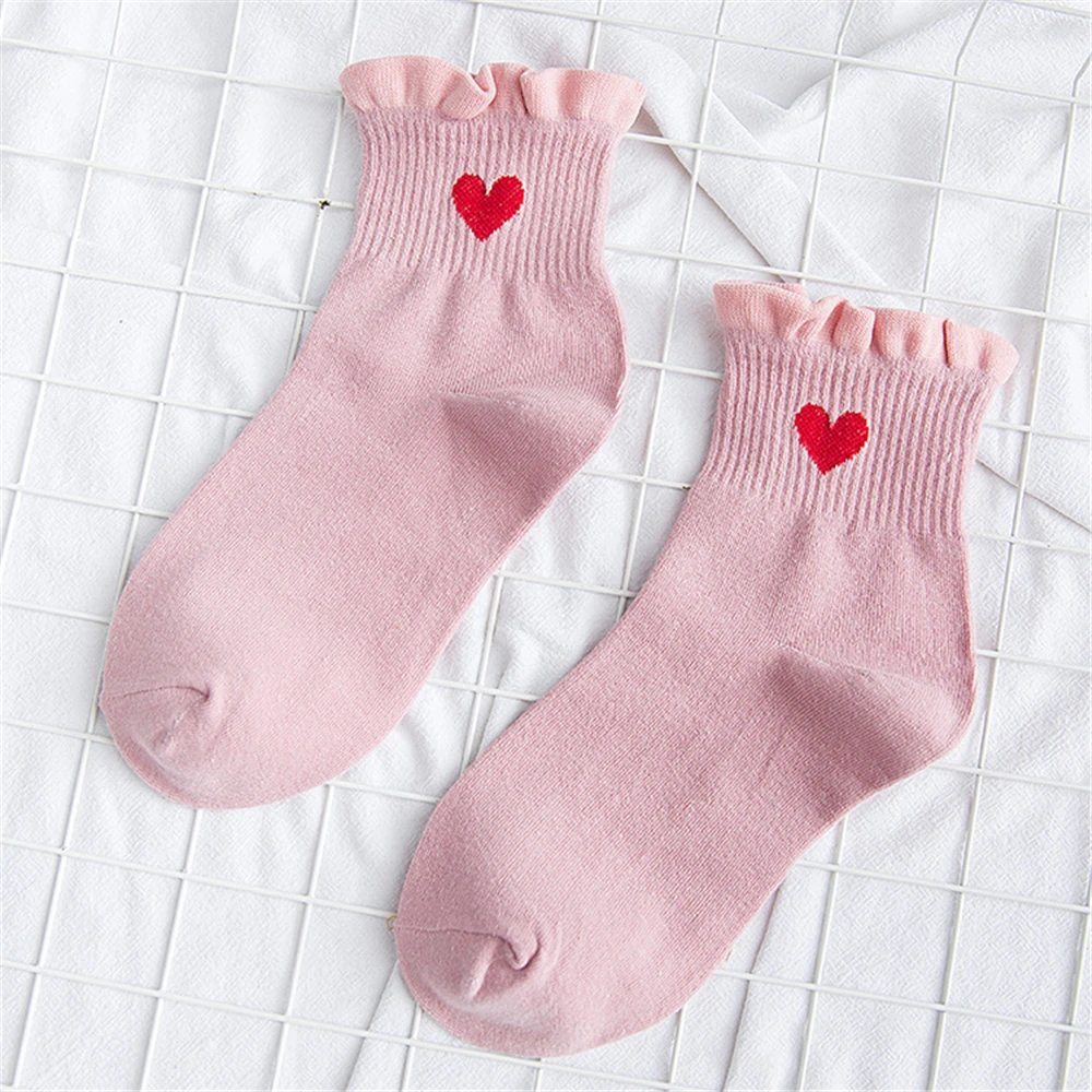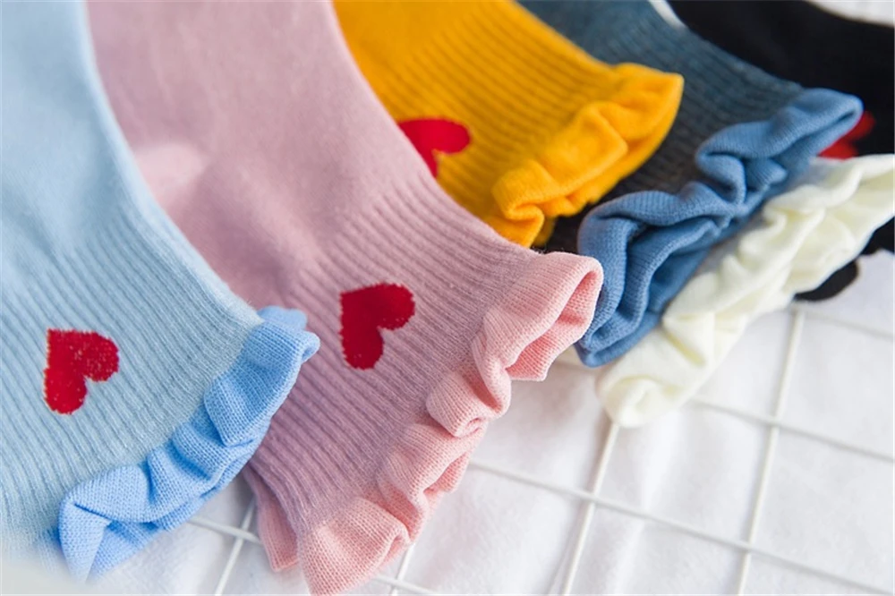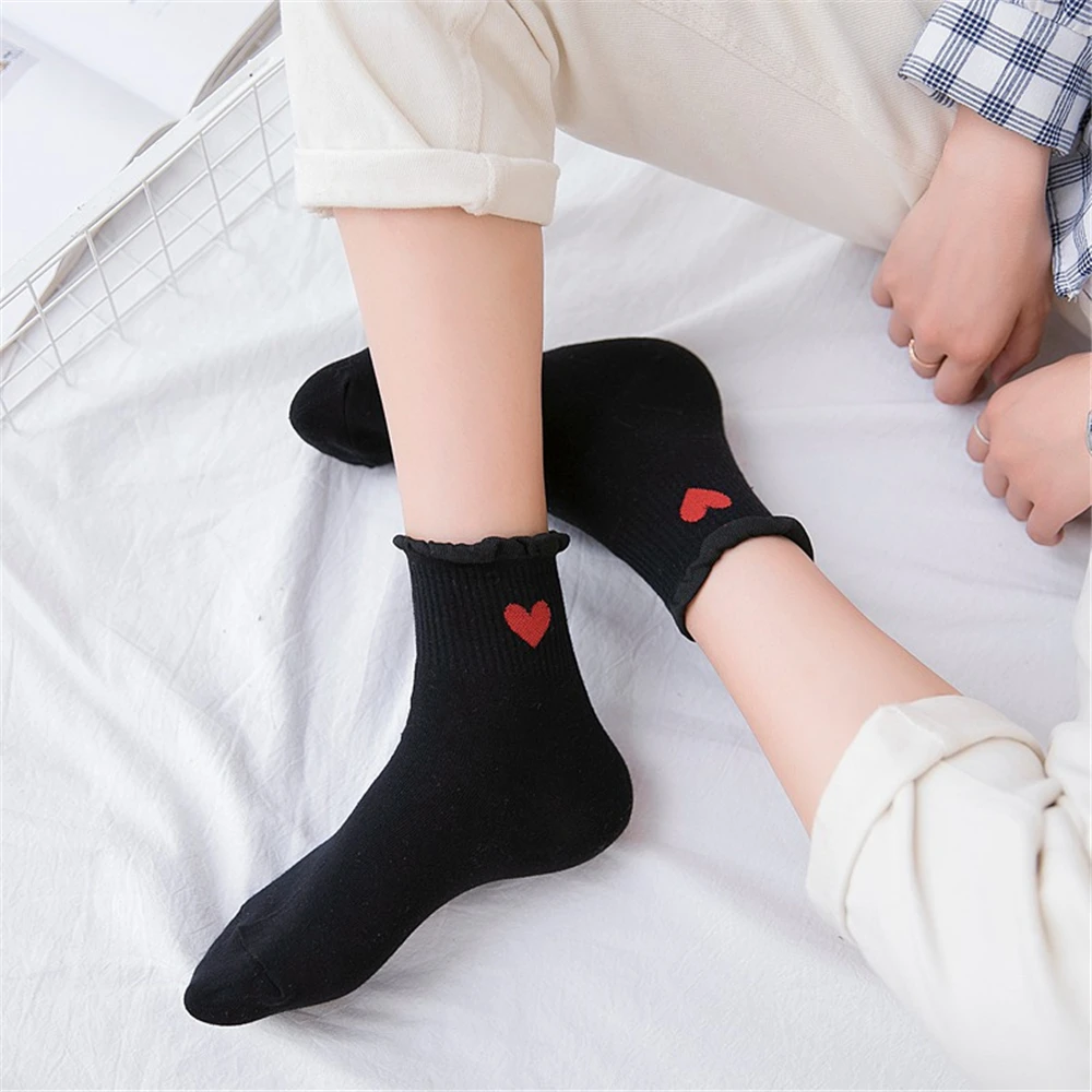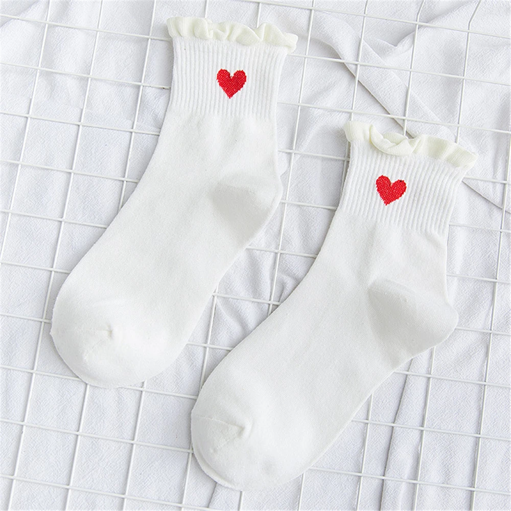 Новинка, женские модные мягкие хлопковые носки с красными кружевными сердечками и оборками, летние и весенние милые разноцветные мягкие носки в стиле "Лолита"