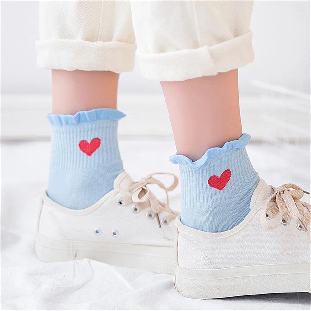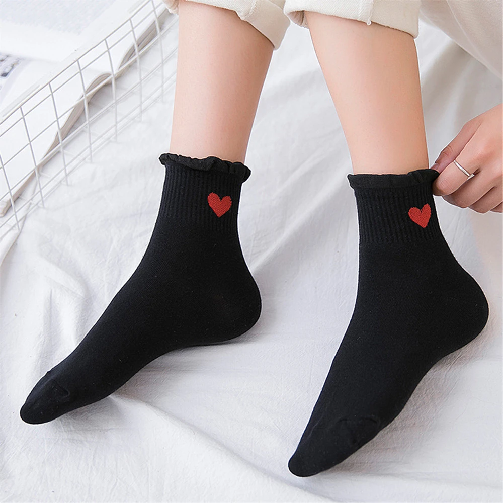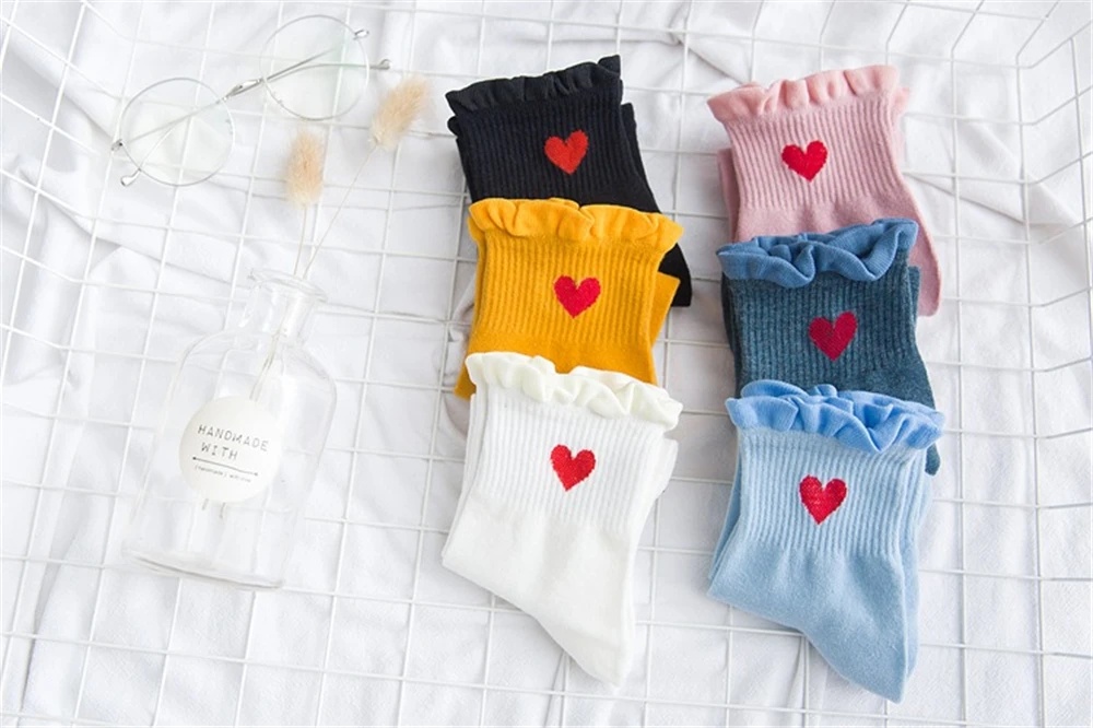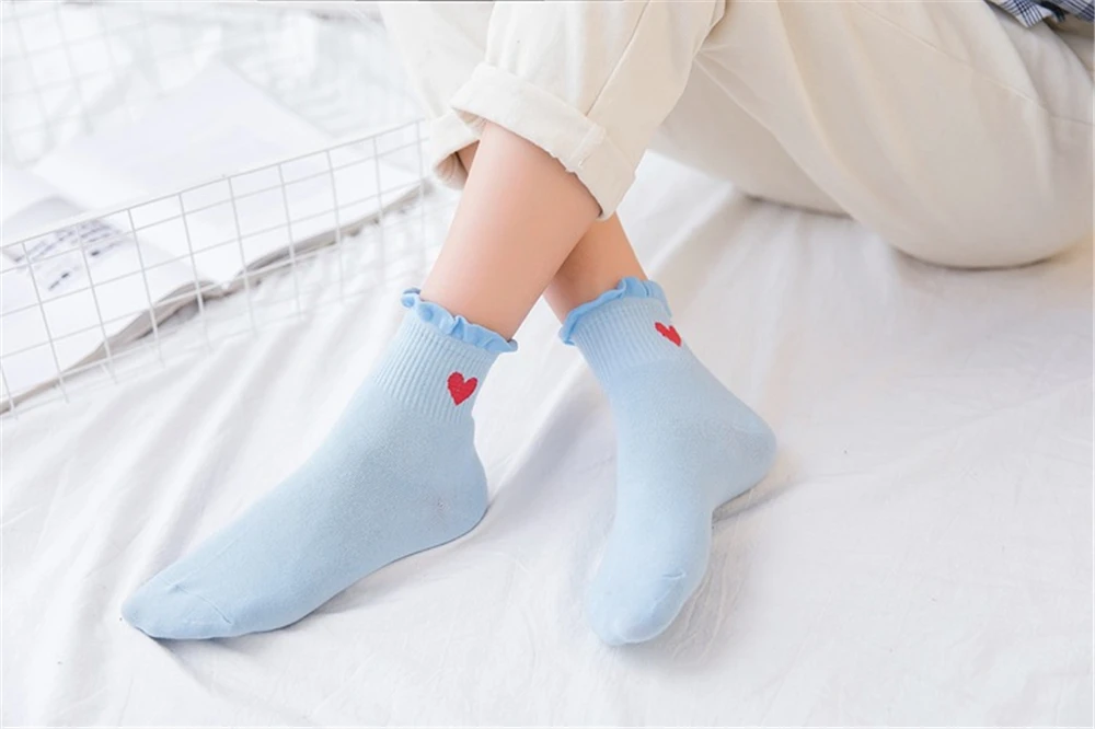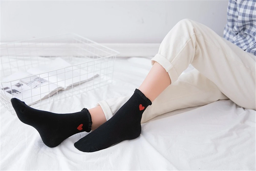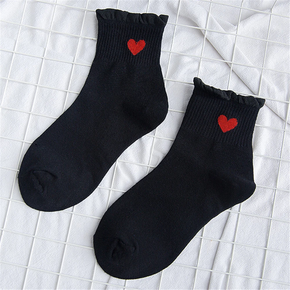 Новинка, женские модные мягкие хлопковые носки с красными кружевными сердечками и оборками, летние и весенние милые разноцветные мягкие носки в стиле "Лолита"