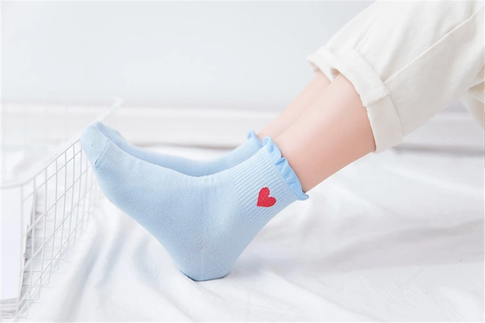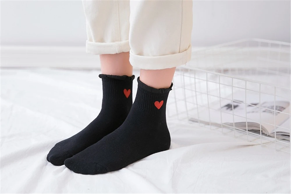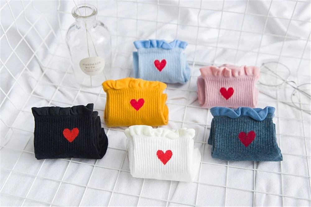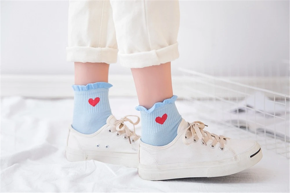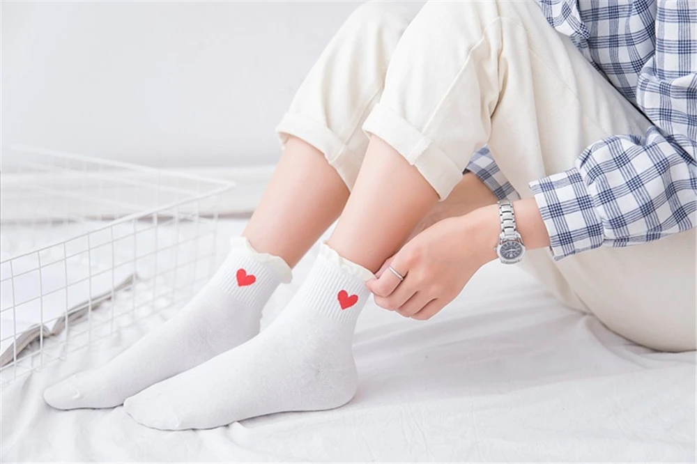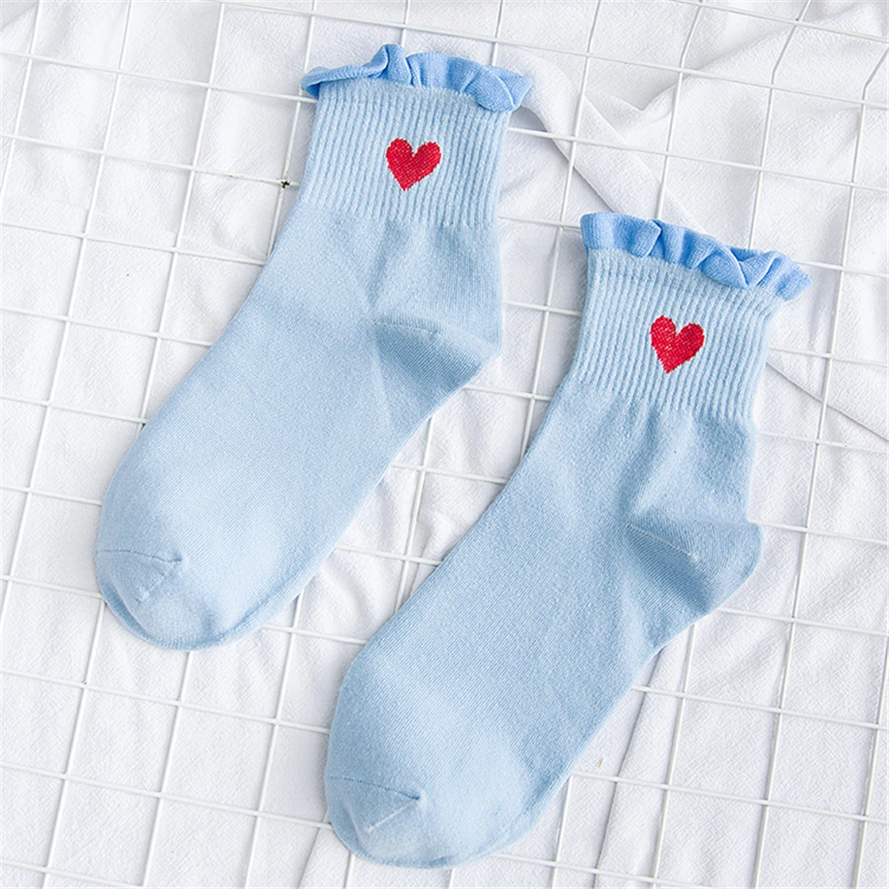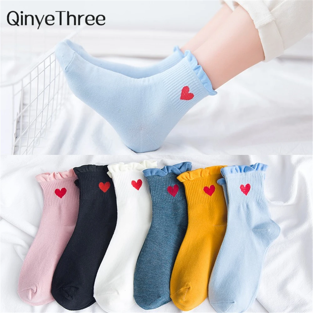 Новинка, женские модные мягкие хлопковые носки с красными кружевными сердечками и оборками, летние и весенние милые разноцветные мягкие носки в стиле "Лолита"