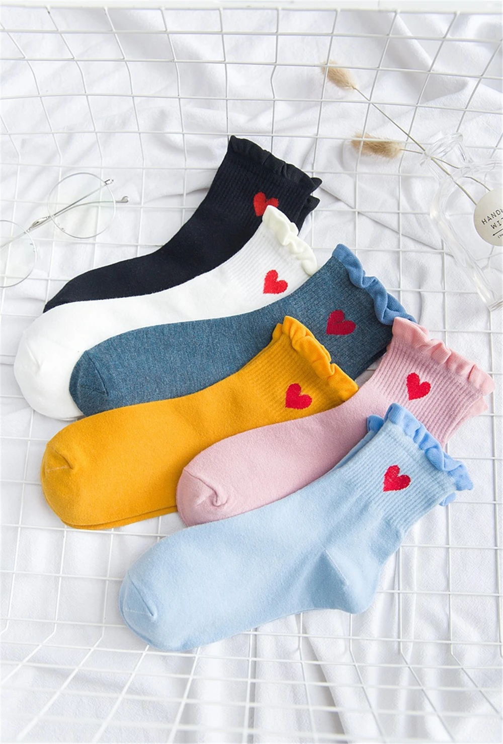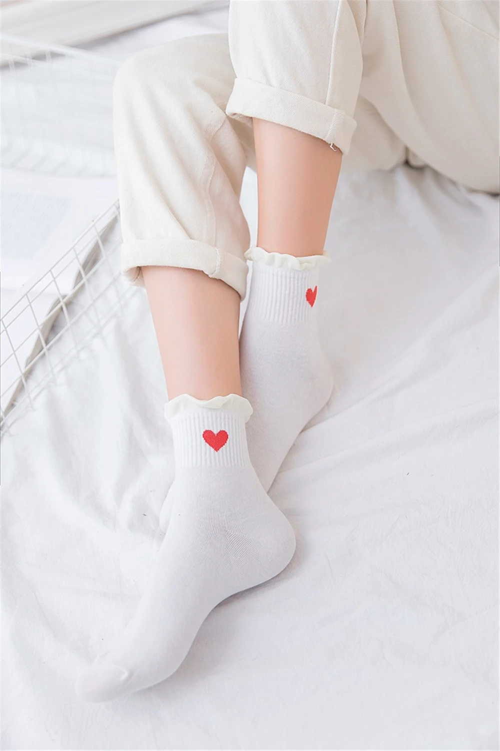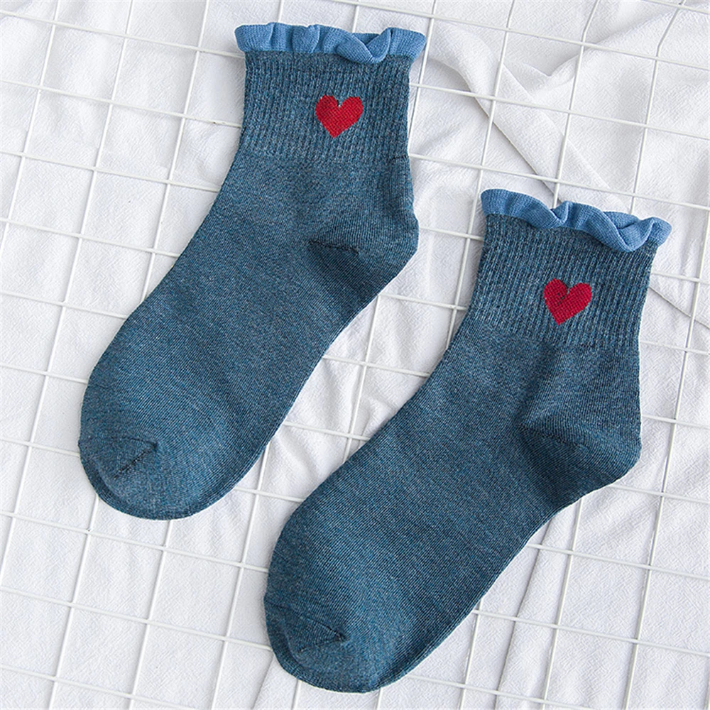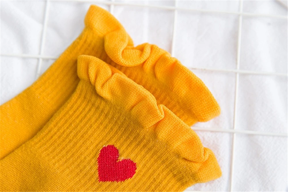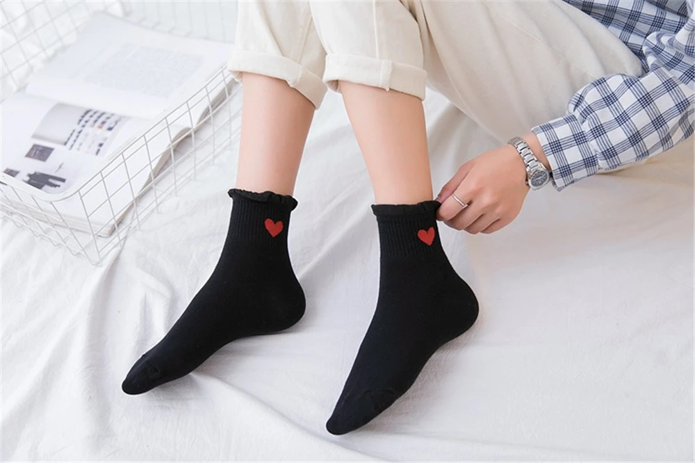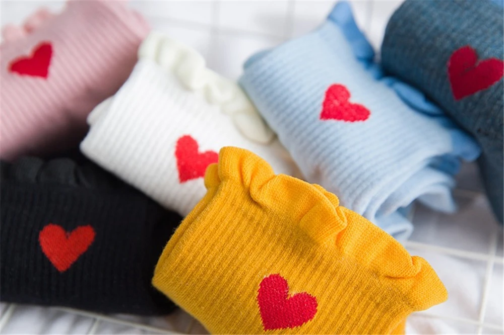 Новинка, женские модные мягкие хлопковые носки с красными кружевными сердечками и оборками, летние и весенние милые разноцветные мягкие носки в стиле "Лолита"