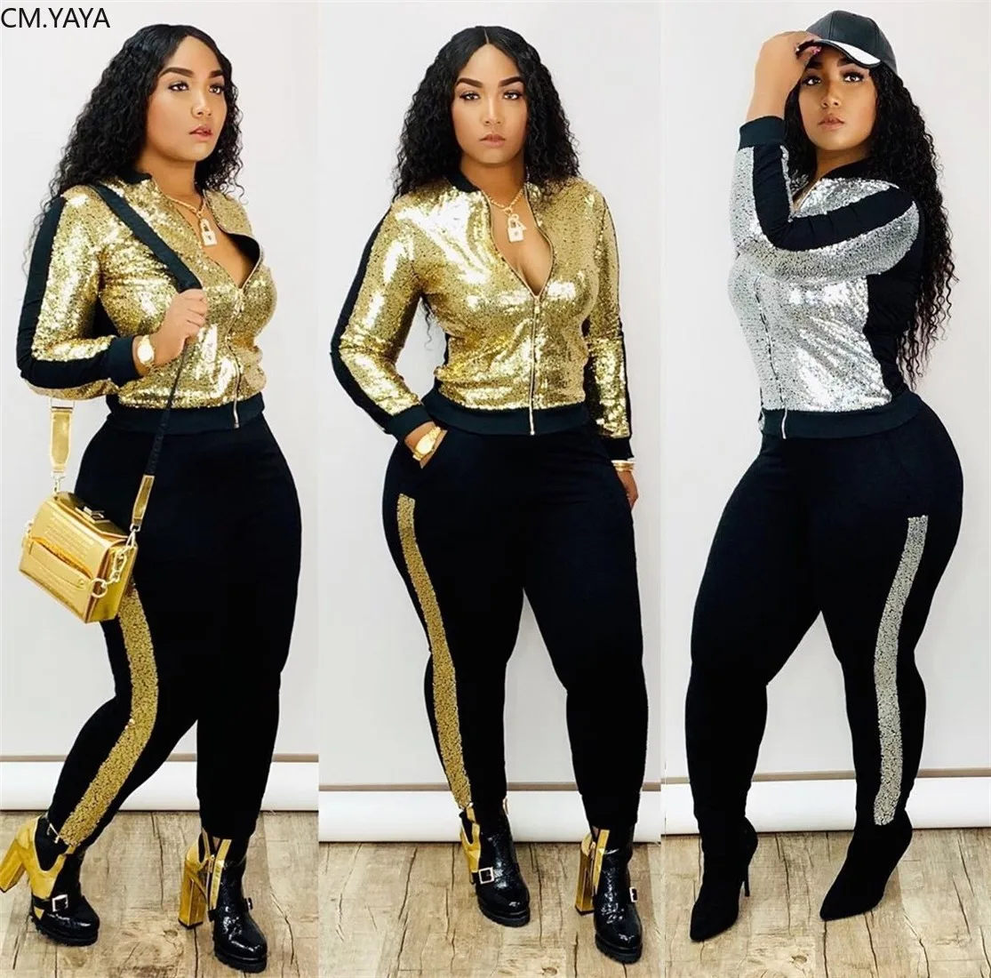 S-3XL зима для женщин комплект ювелирных изделий с длинными рукавами спортивный костюм с блестками куртки топы, штаны костюм из двух частей комплект ночной клуб вечерние осенний наряд для G5148