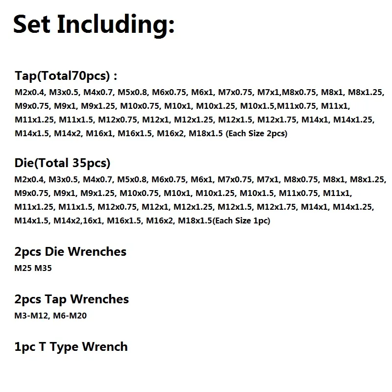 Этот набор кранов и штампов изготовлен из высокоскоростной стали для долговечности и длительного срока службы.Ключи очень удобны и практичны, в этом наборе 5 гаечных ключей.Регулируемый ключ может легко и надежно зажимать краны или штампы. В основном используется для ручного нарезания и нарезания резьбы.Этот набор содержит много нажатий и штампов разных размеров для различных нарезания и нарезания резьбы.Это отличный набор инструментов, используемый для резки или формирования женской и мужской части гаек или болтов.