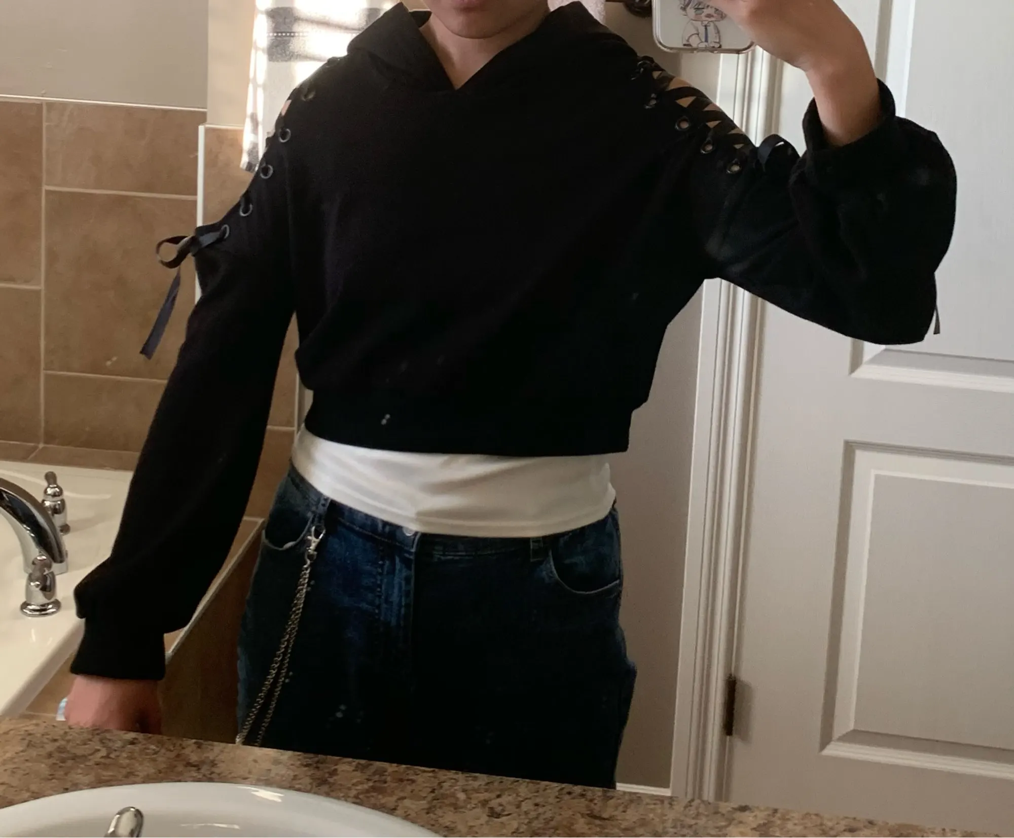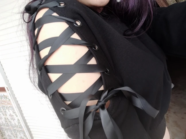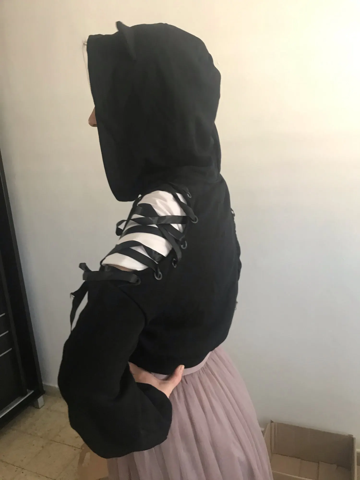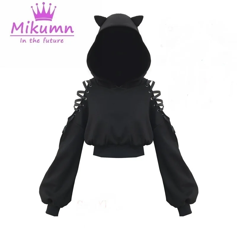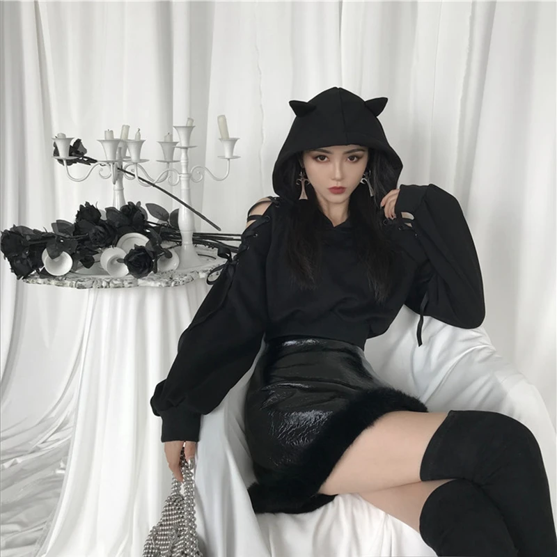 Женская Толстовка Harajuku, в стиле панк, Готическая толстовка, Осень-зима, с вырезами, на шнуровке, с длинными рукавами, толстовки с милыми кошачьими ушками