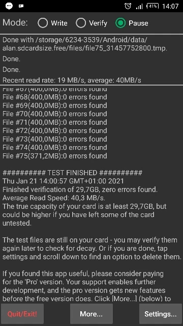 Господа. Проверяйте карты не только прогами h2testw и DiskMark, но и FlashMemoryToolkit. С Али имею карты на 32 Трансценд, Тошиба, Кингстон, Нетак (про эту начитался хороших отзывов). Так вот все они (проверял в USB 2.0) в прогах h2testw и DiskMark показывают нормальные результаты, а в FlashMemoryToolkit результаты интереснее. А именно: Кингстон и Нетак при записи каждые 3-4 сек имеют резкие провалы скорости: Кингстон с 18 до 5, Нетак с 18 до 0,1 !!!. На Нетак тлф Хуавей Р10 ругается на низкую скорость карты, а регик (на проце A7LA70) отказывается на нее записывать. На Кингстон тлф не ругается, а регик пишет с пропусками. Трансценд и Тошиба имеют небольшие хаотичные западения скорости записи (не более минус 2 от средней). Сандиск показывает «синусоидально» плавающую скорость записи от 18 до 12. Сандиск работает и в телефоне и в регике. Тесты Сандиск на фото + фото результата теста бракованной Нетак.