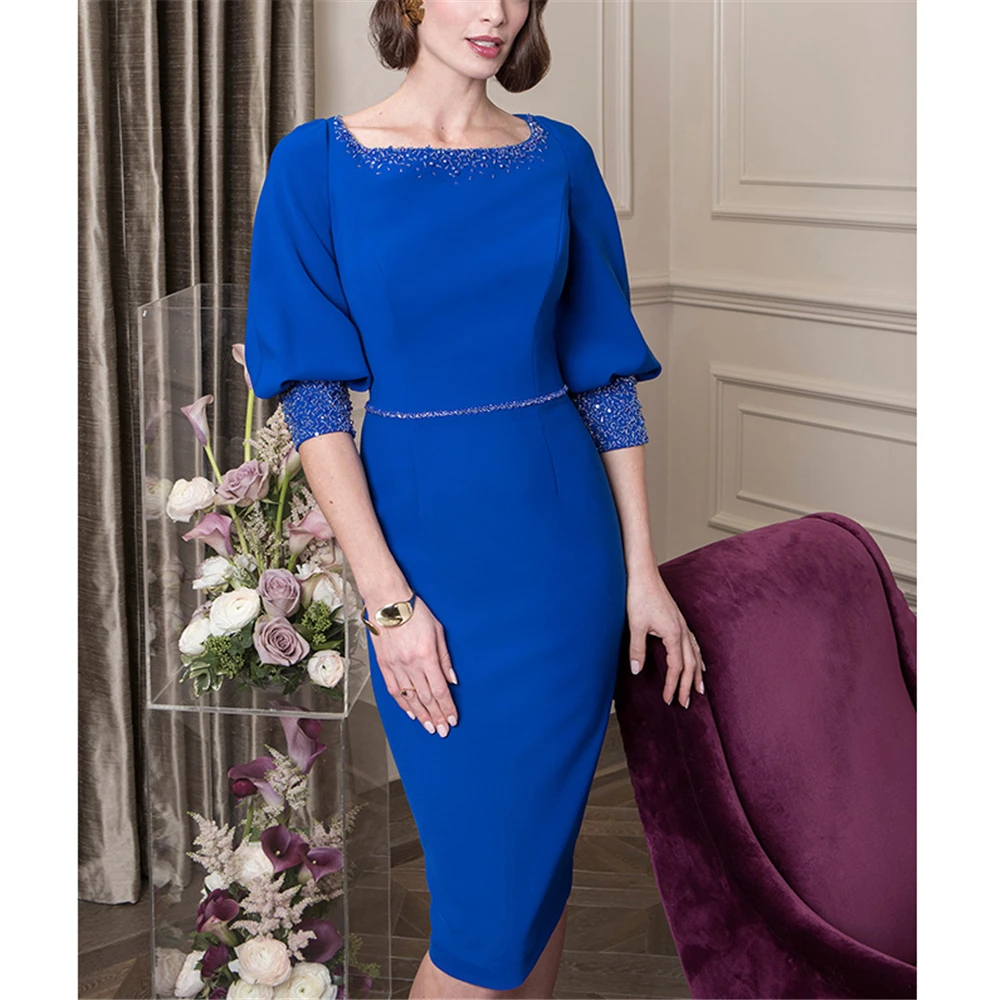 Женское платье-футляр до колена, Синее Короткое вечернее платье с полурукавами, расшитое бисером, для матери невесты, на заказ, в стиле знаменитостей
