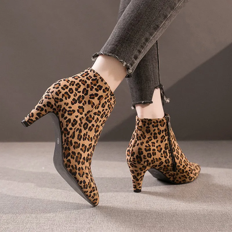 Женские ботильоны на высоком каблуке-шпильке с острым носком, леопардовая расцветка, модные женские полусапожки из флока, Женская Короткая Повседневная обувь из плюша, B037