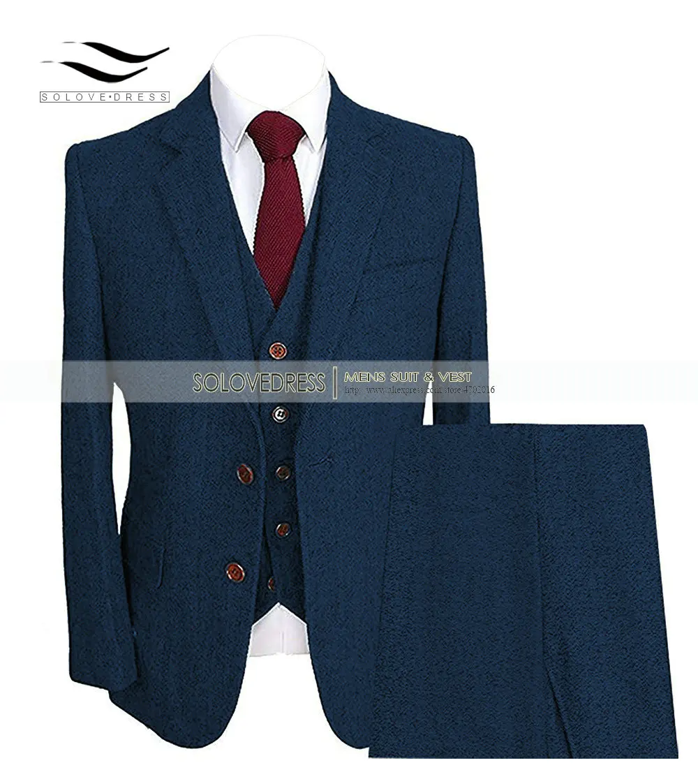 Мужские костюмы с тупым толстым узором в елочку, деловое шерстяное твид, 3 предмета, строгие смокинги с отворотом, Блейзер, приталенный, зимний, Свадебный, для жениха