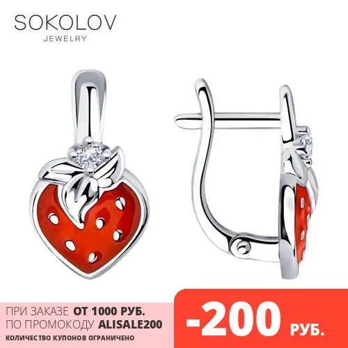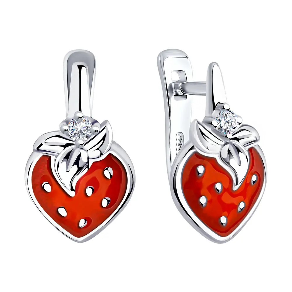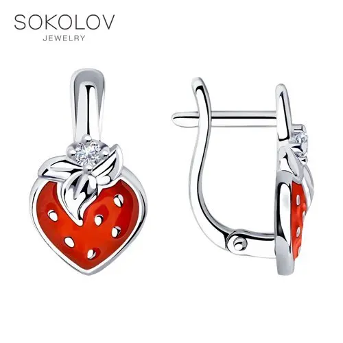 Серьги SOKOLOV из серебра с эмалью и фианитамиКлубника! Ммм… Сочная, яркая, самая вкусная. Эти серьги привлекают внимание выразительным дизайном: акцентная алая краска на серебряном фоне. Внимание уделено мельчайшим деталям, благодаря чему клубничка выглядит как настоящая. Каждую ягодку венчает сияющий фианит. Забавный дизайн, отсутствие подвесных элементов и надёжный английский замок – слагаемые идеального детского украшения. Отличный подарок на детский день рождения!