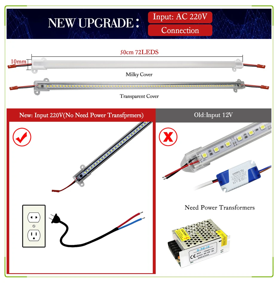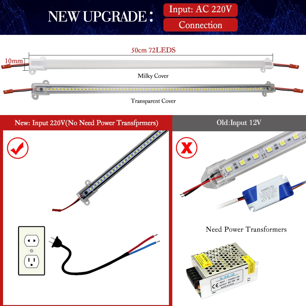 Светодиодная панель AC220V, светодиодные флуоресцентные трубки, кухонная лампа высокой яркости, 8 Вт, 50 см, 72 светодиода, 2835 светодиодов, жесткая полоса 5 шт.лот