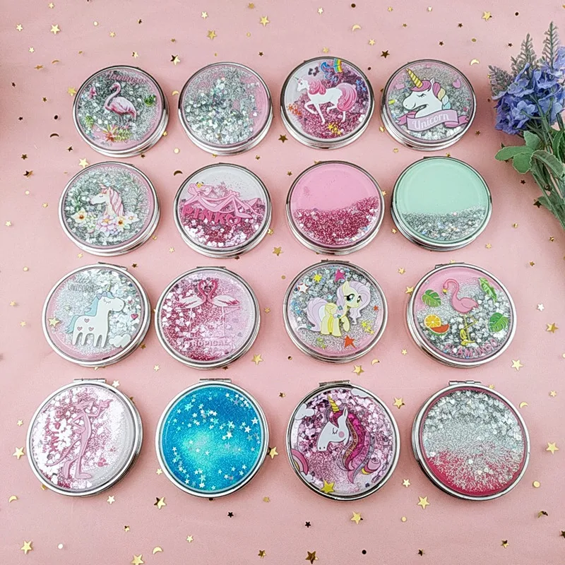 Компактное карманное зеркало для макияжа с изображением единорога, портативное двустороннее складное косметическое зеркало, подарки с переливающимся сверкающим песком