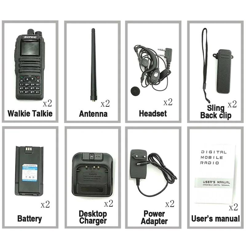 2 х Baofeng DM-1701 (VHF136-174 & UHF 400-470 МГц) 2 литий-ионных аккумулятора (7,4 V 2200mah) 2 x двухдиапазонная антенна Настольное зарядное устройство-2 шт. (Вилка стандарта США/ЕС/Великобритании/Австралии) 2 x адаптер питания 2 x Зажим для ремня Слинг-2 шт. 2 xГарнитура 2 xРуководство пользователя