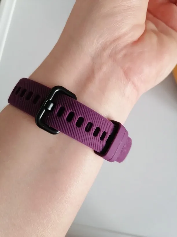 Цвет очень красивый. На Honor band-5 -734 сел идеально. Заглушки тоже использовала от нового браслета. Пришел за 1,5 месяца.