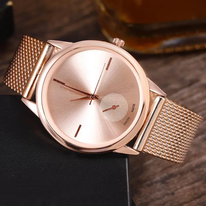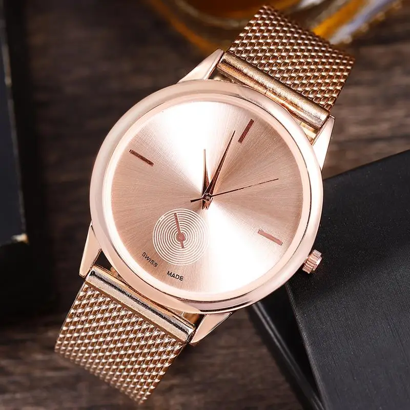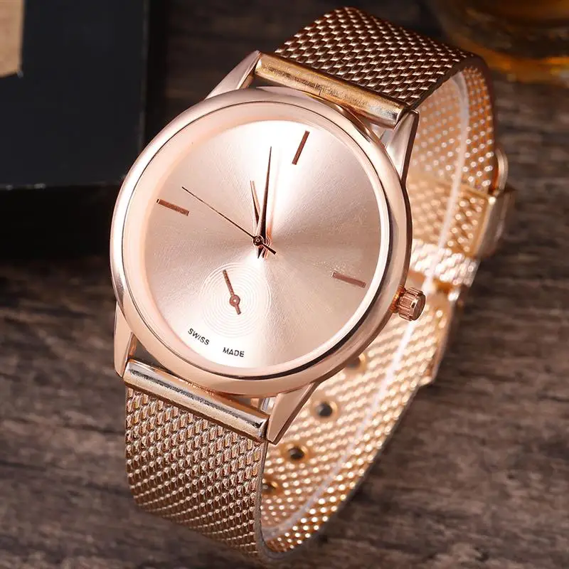 Часы женские, из нержавеющей стали, с розовым браслетом Золотой металлический сетчатый