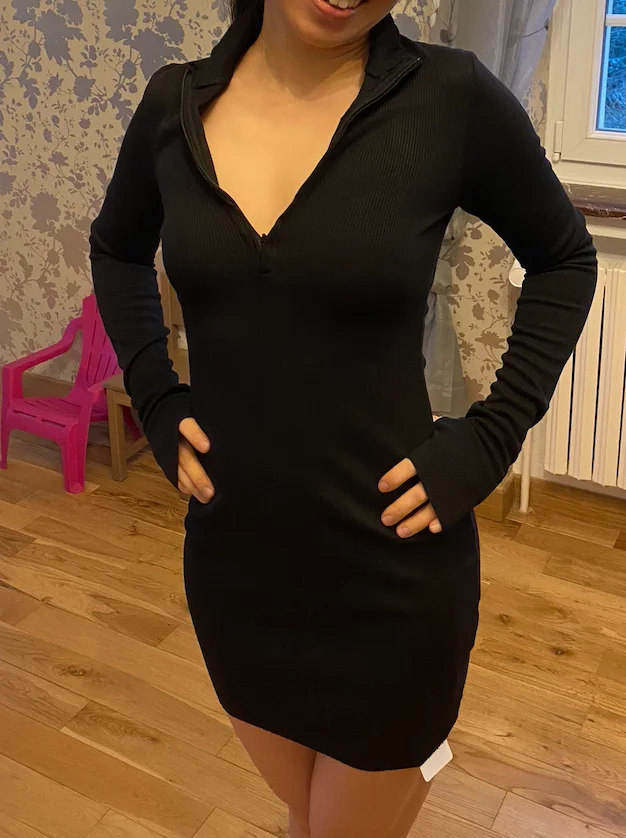 Платье очень красивое, короткое, а края не с отворотом. У меня было платье довольно быстро и в хорошем состоянии, размер правильно, я сделал 34 на 60 метров, и я получил его в S. Ткань Горячая, и я уже прошел к машине c ок. Застежка работает очень хорошо, и есть также деталь на рукавах, чтобы положить их в варежки