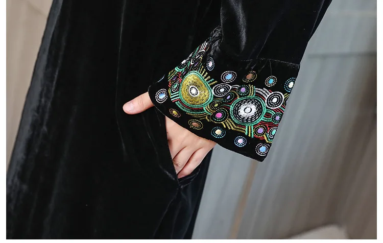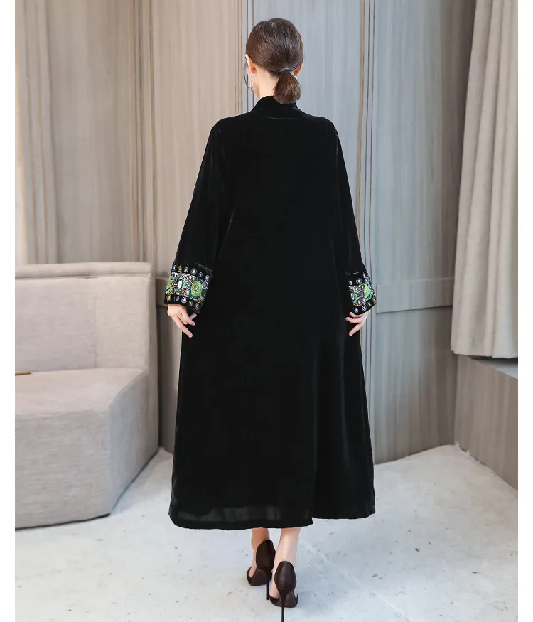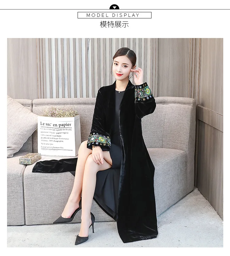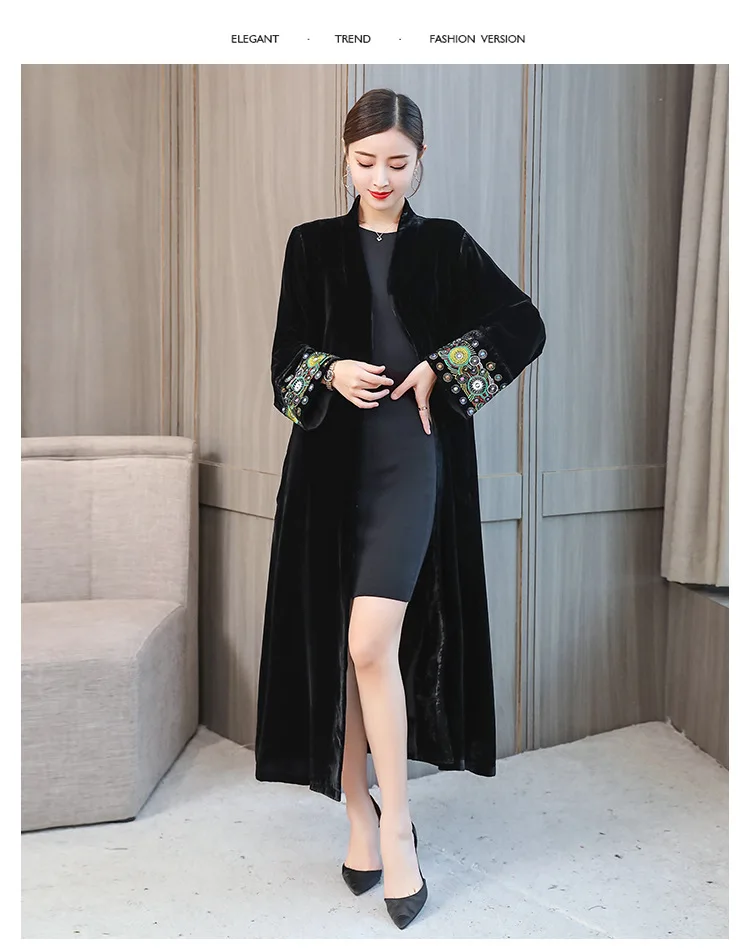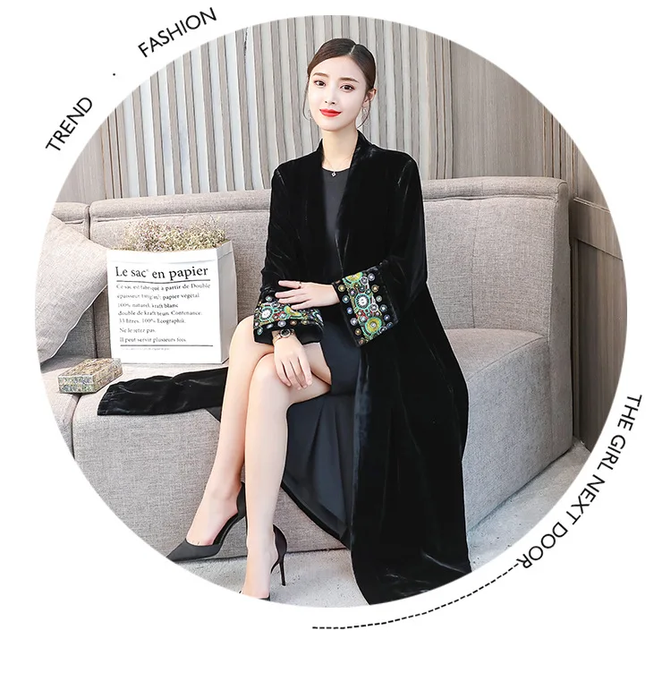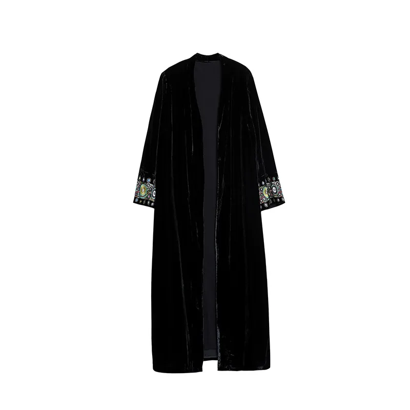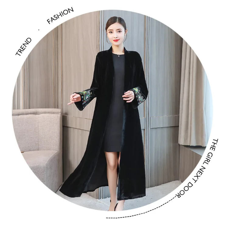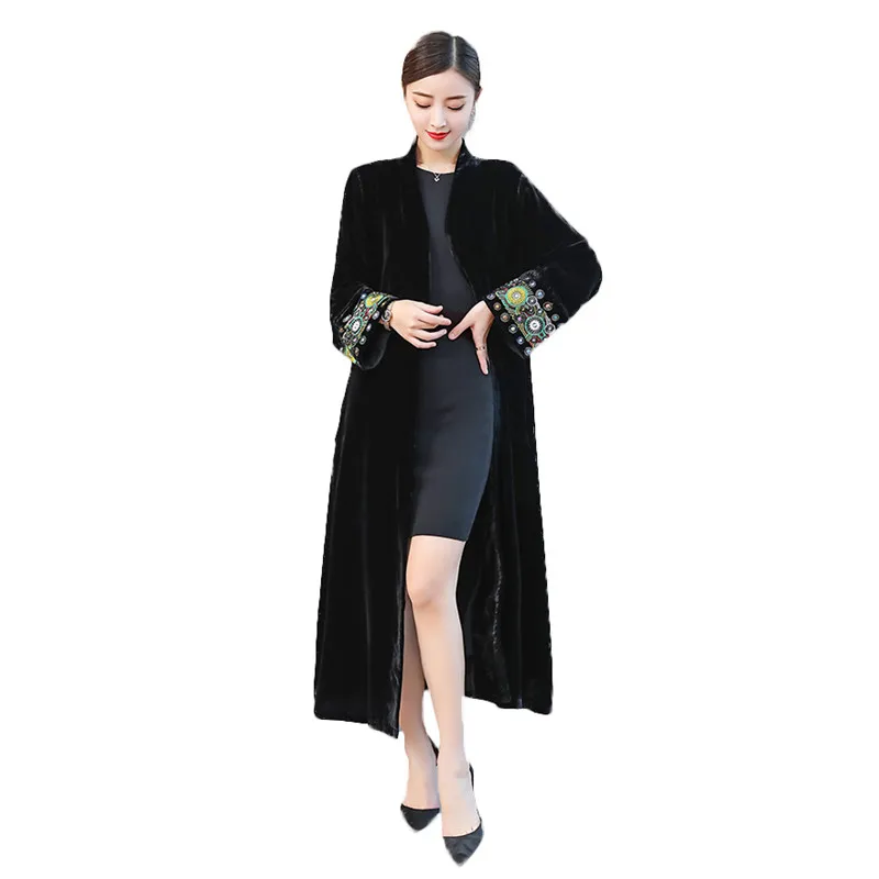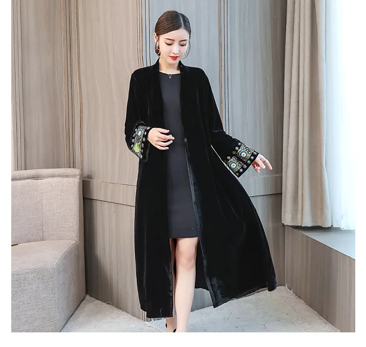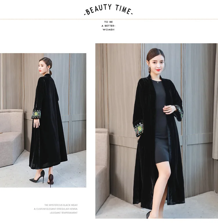 2022 элегантный кардиган с вышивкой, Женская ветровка, пальто, Женский демисезонный длинный Тренч, пальто, черная бархатная верхняя одежда