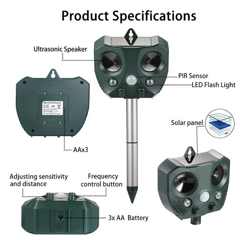 Ультразвуковой отпугиватель животных на солнечной батарее, уличный ...