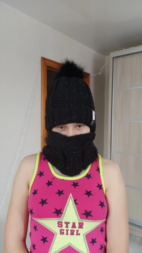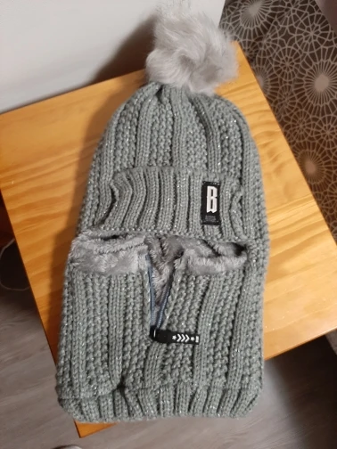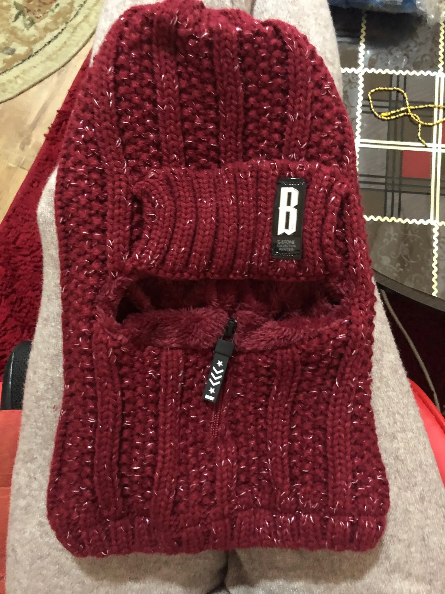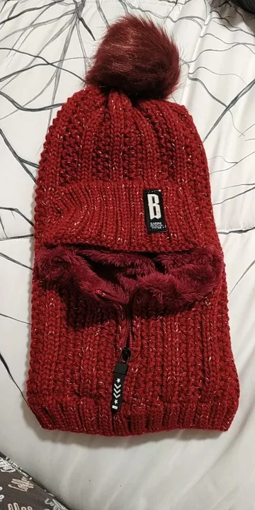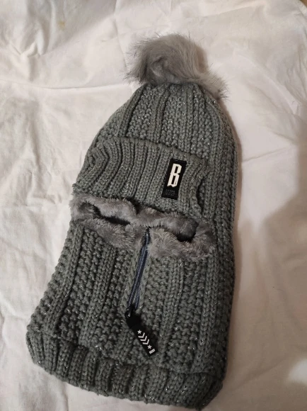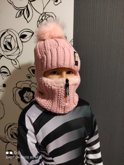 Шапочка классная, выглядит как на фото, тепленькая, можно не застегивать, можно до глаз щастегнуть как маску, шея закрыта, удобно, не сместится никуда как шарф. Пришла очень быстро.