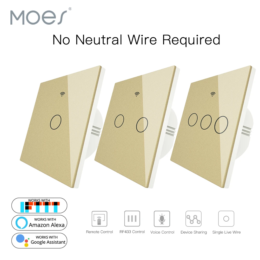 Настенный выключатель Smart Life, золотой, Wi-Fi, без нейтрального провода, беспроводной, дистанционное управление Tuya, работа с Alexa RF433