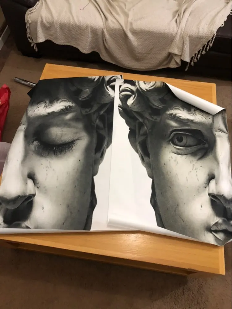 Эти мужчины великолепны! Приходят в тубе, поэтому немного заворачиваются. Одно полотно немного желтее, чем другое, но это не сильно бросается в глаза. Запаха никакого нет. Доставили очень быстро. Рекомендую к покупке!